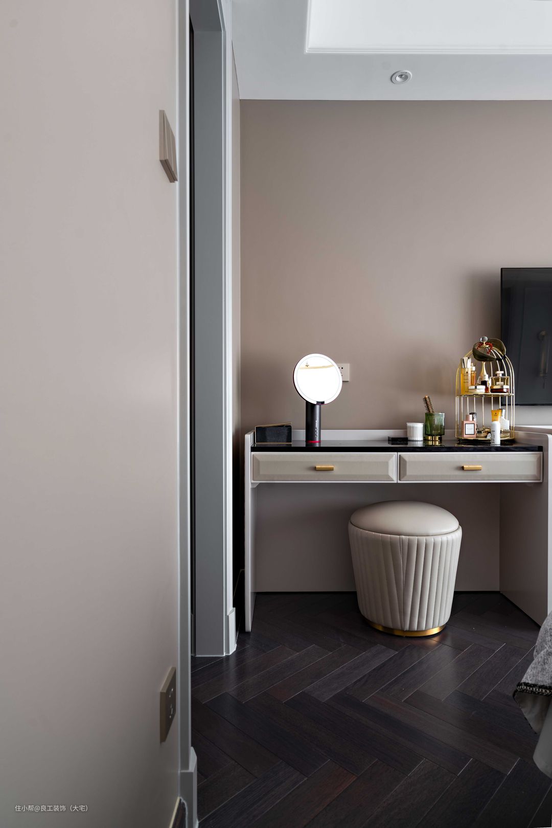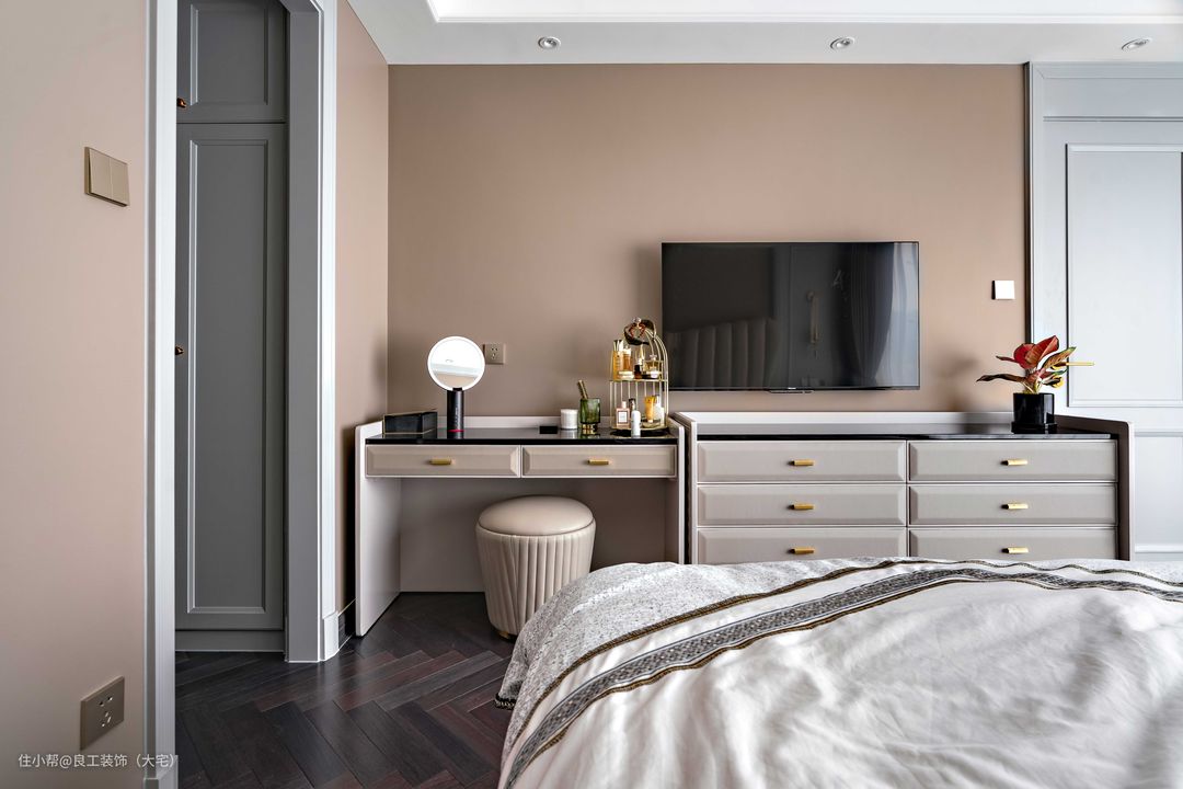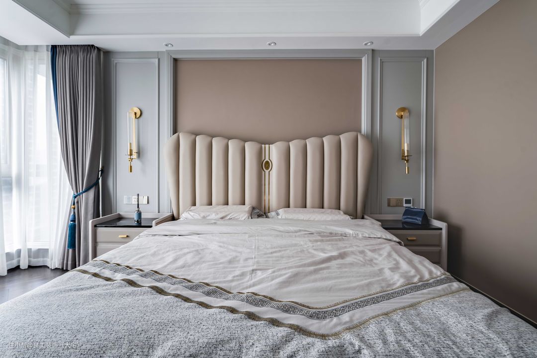 低饱和度的主卧安静耐看,奶茶色背景墙颇有温馨感,整体透露出的是优雅与舒适。