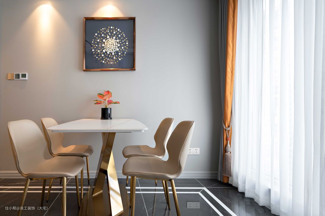 客餐厅呈开放式格局,餐桌椅也选择与客厅家具配套款式,形成了整体和谐的呼应,视觉上更开阔大气。