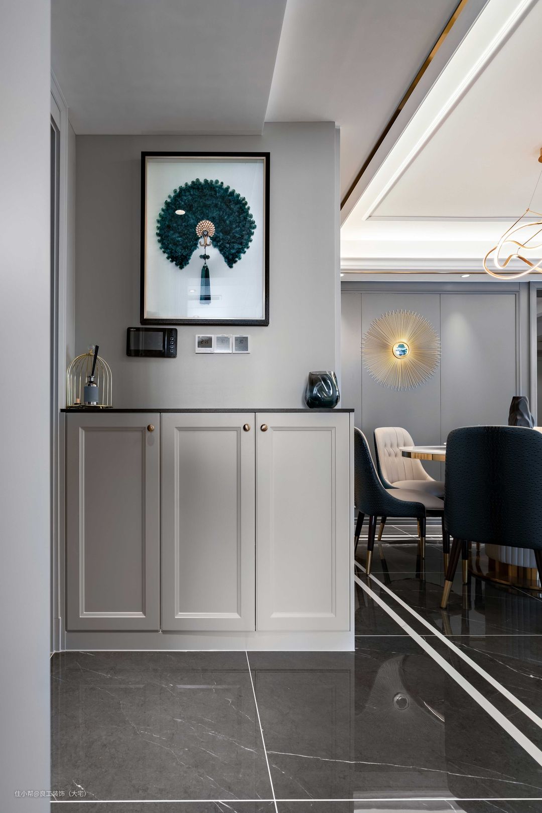灰色护墙板,黑色地砖,让客厅硬装上就保持中性基调,搭配双色圆弧沙发,营造出简约大气的空间效果。孔雀蓝与浅米色交织出的清朗明亮,让整个家优雅起来。