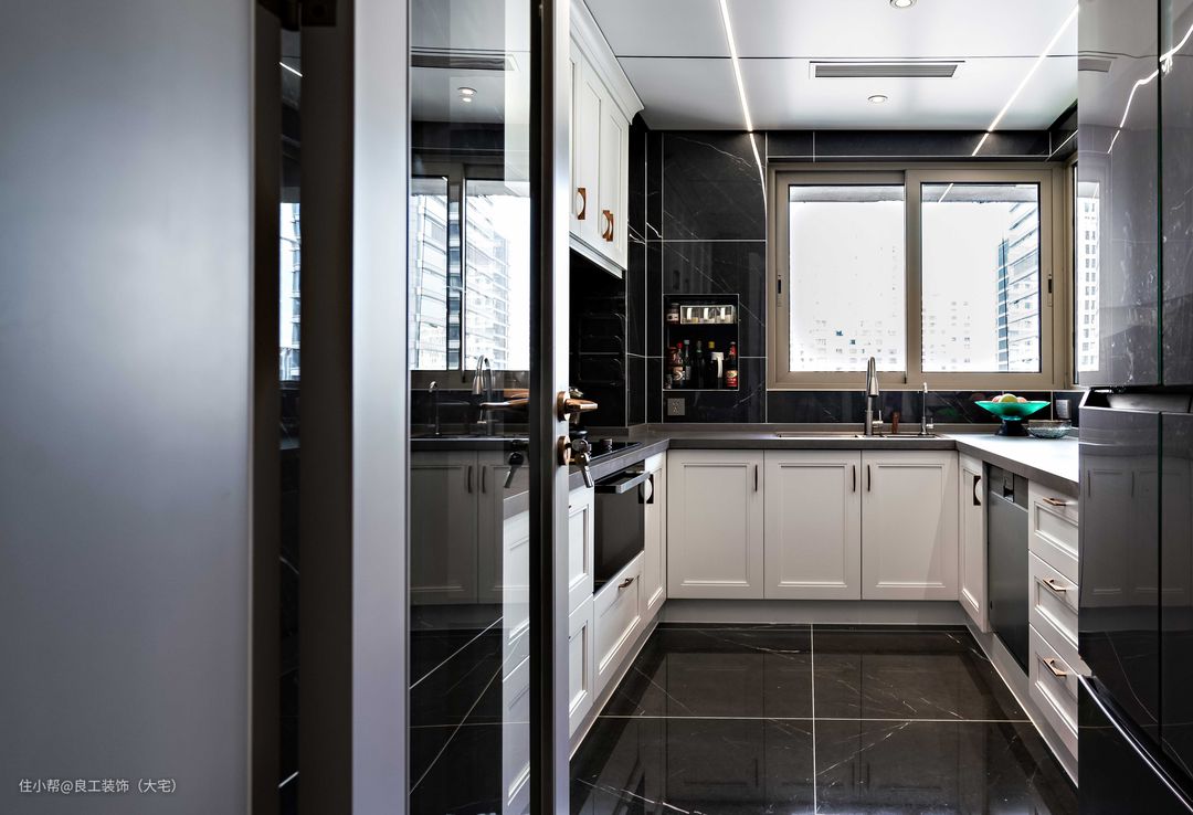 厨房是开阔式的深U造型,黑白配色时尚大气,不会过时,搭配条形金属把手,气质满分。