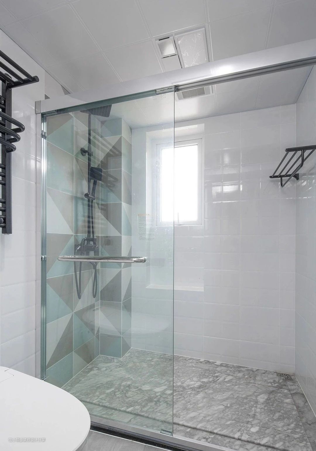 卫生间淋浴区地面采用大理石拉槽防滑,并留出导流槽,黑色五金搭配花砖背景,电热毛巾架功能实用。