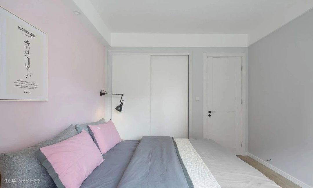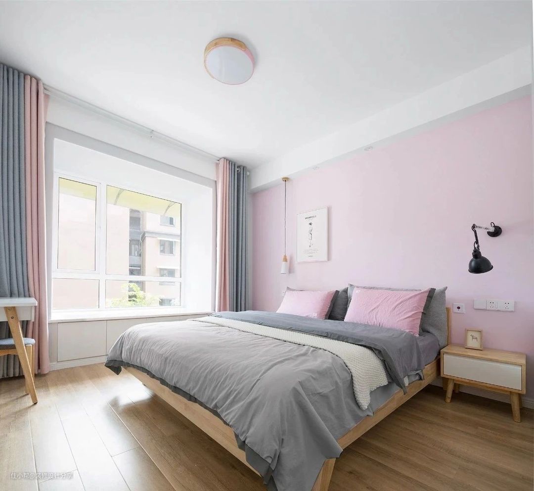 主卧,整体调性采用粉色系,也是女业主超喜欢的颜色,与木色家具、灰色布艺搭配,自然中带着俏皮与活力。