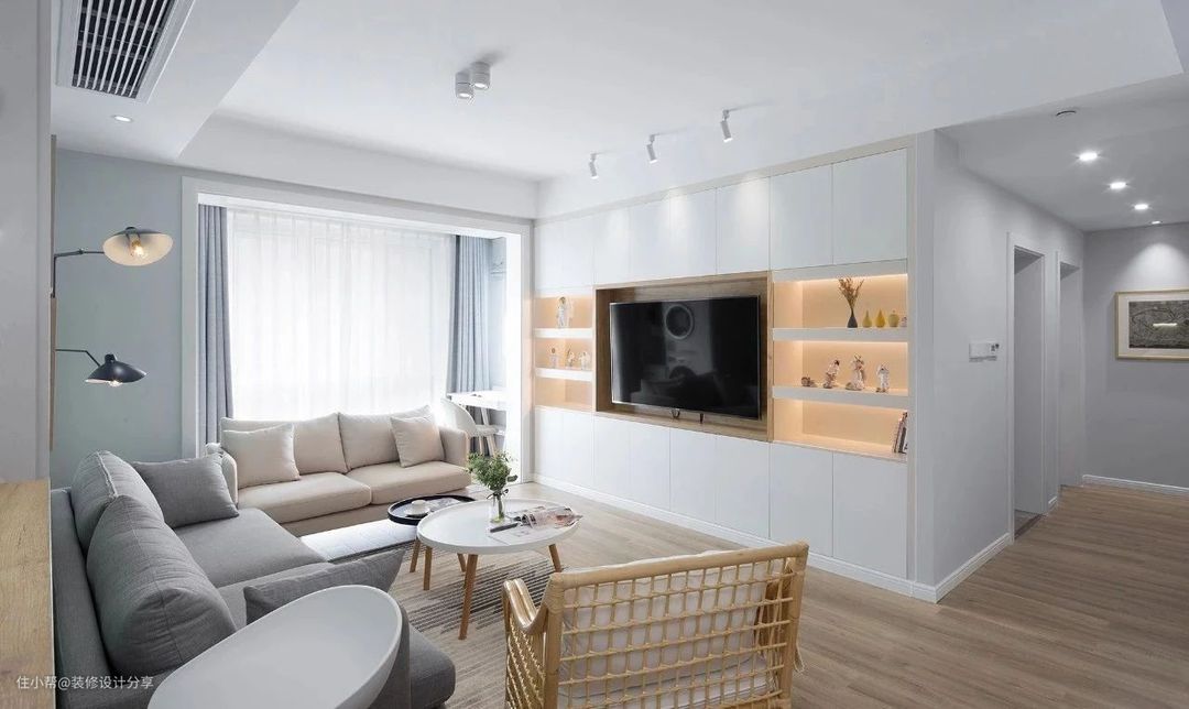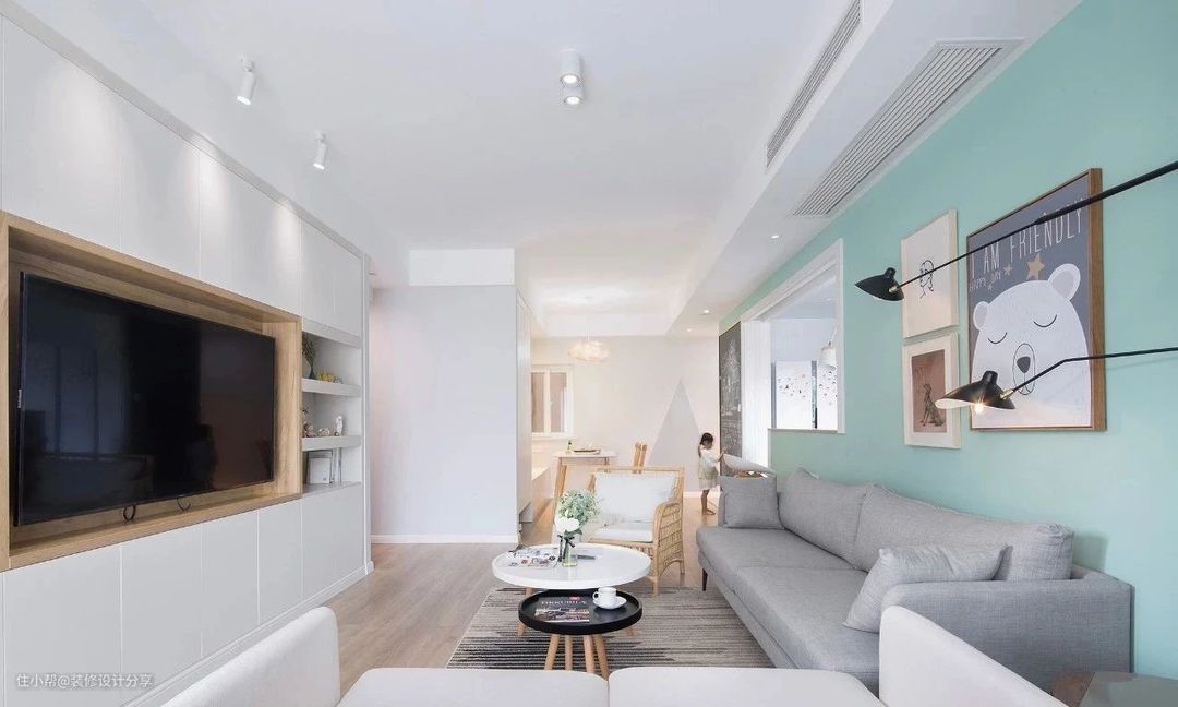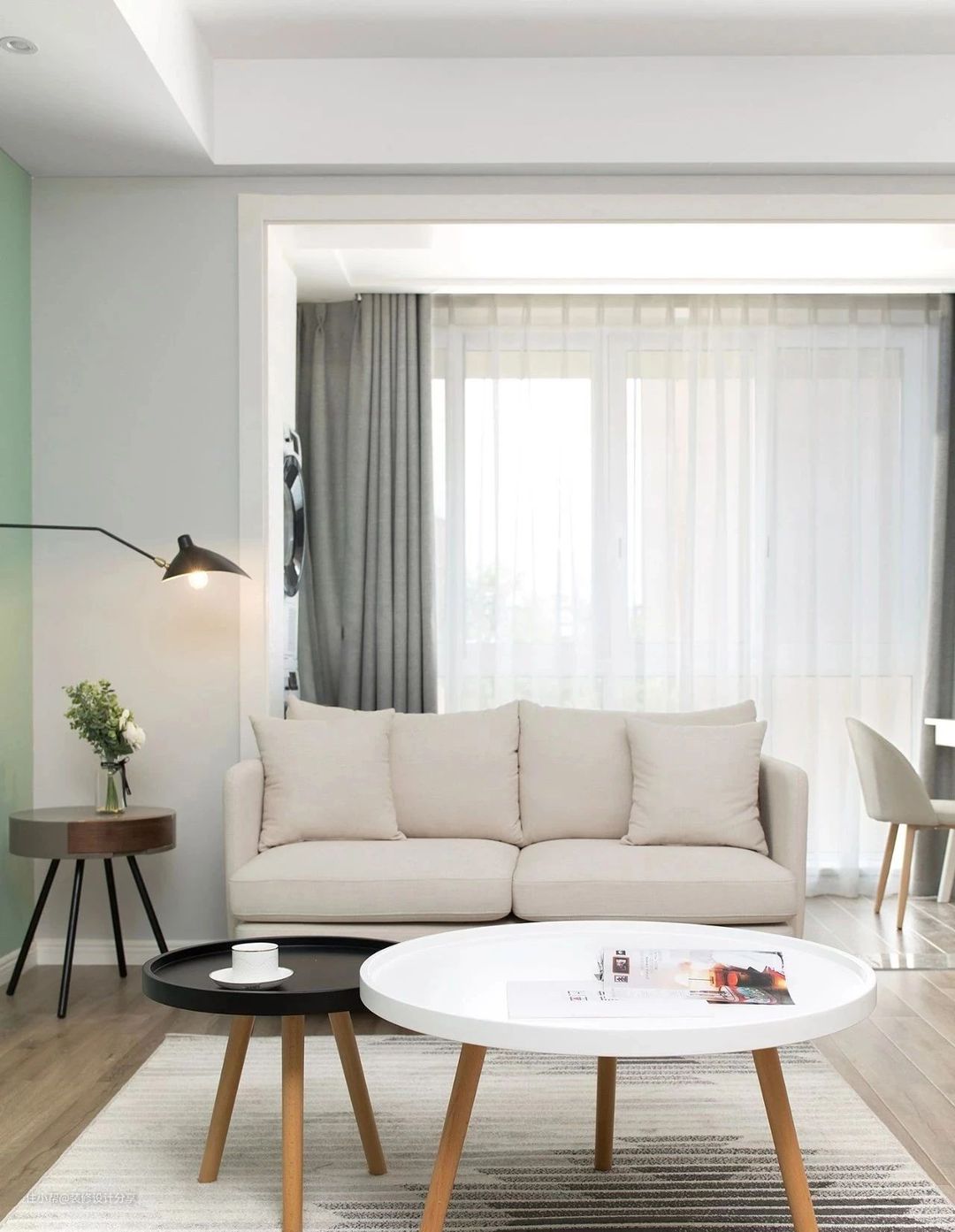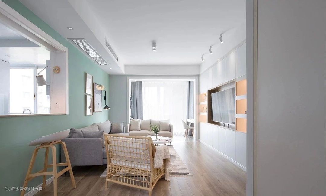 客厅地面通铺原木色地板,顶面采用点光源取代主灯,纳入阳台,拉伸空间视觉。