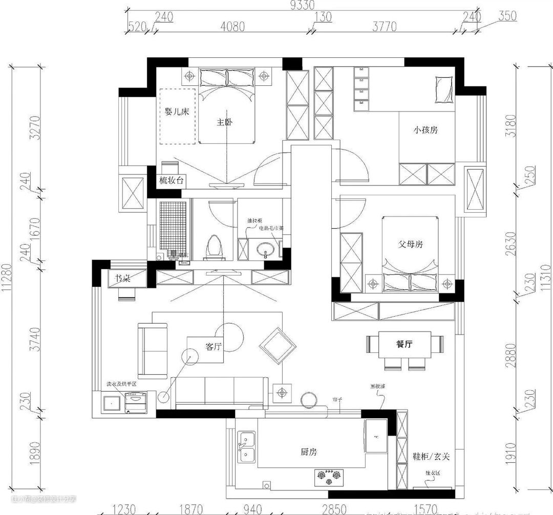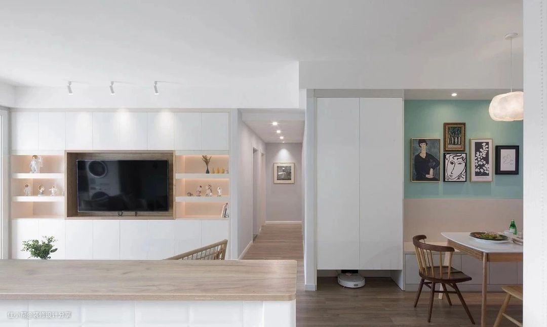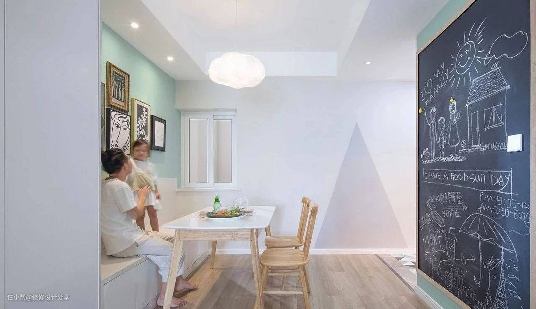 餐厅,为了让过道空间更宽一些,采用卡座的形式,并增加一组储物柜,底部留空给扫地机器人,一组大大的黑板墙让孩子可以发挥想象。