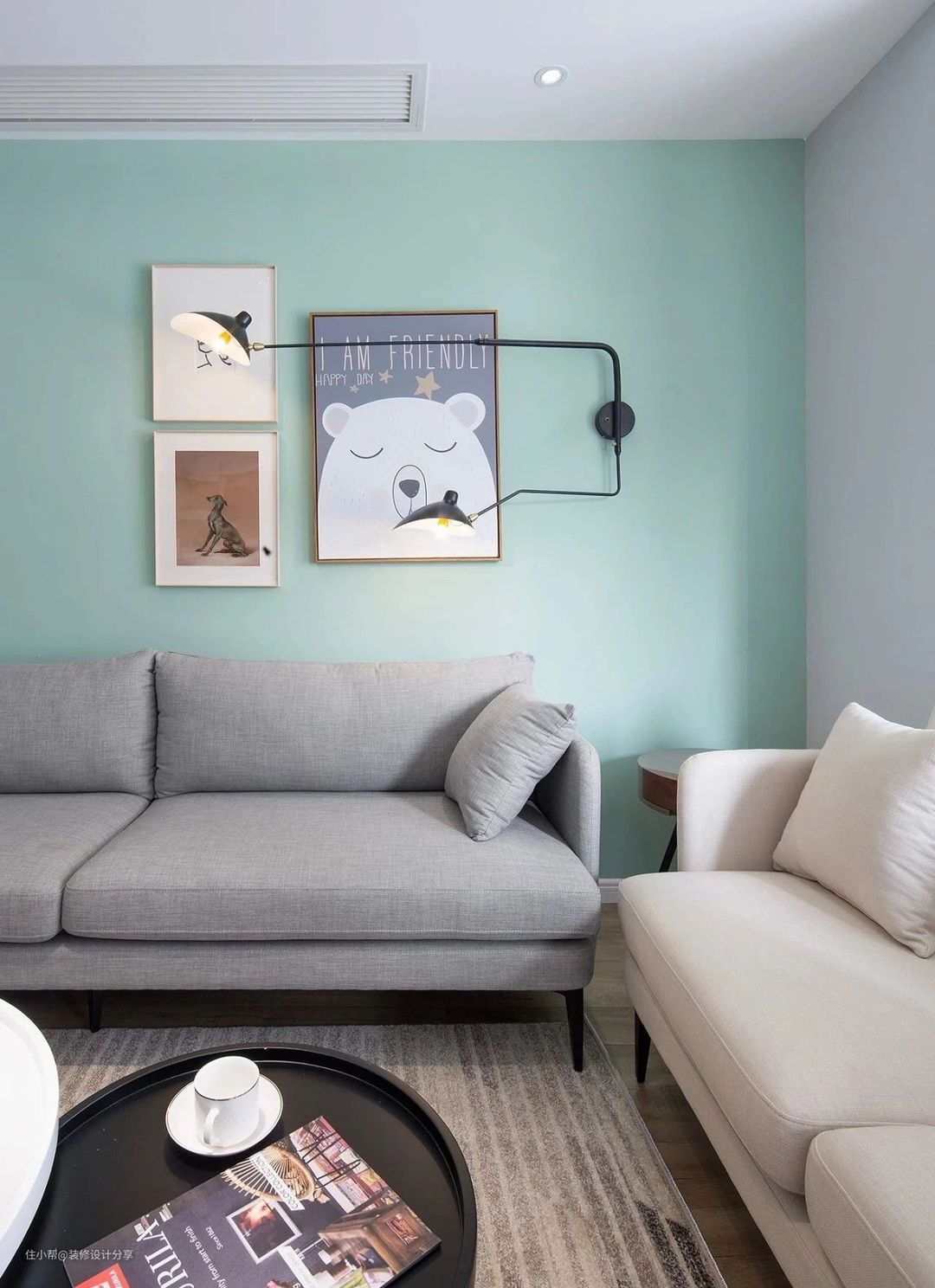 Tiffany蓝色背景点缀装饰画与摇臂灯,灰米色沙发搭配黑白木色茶几+边几。