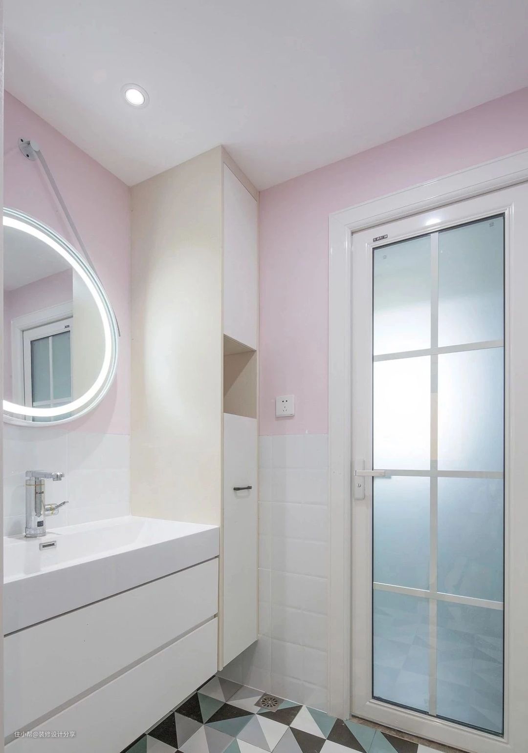 卫生间干湿分区,在洗脸盆旁边设计立柜,收纳化妆品和生活用品,门一关整体美观性超强,兼具实用性。