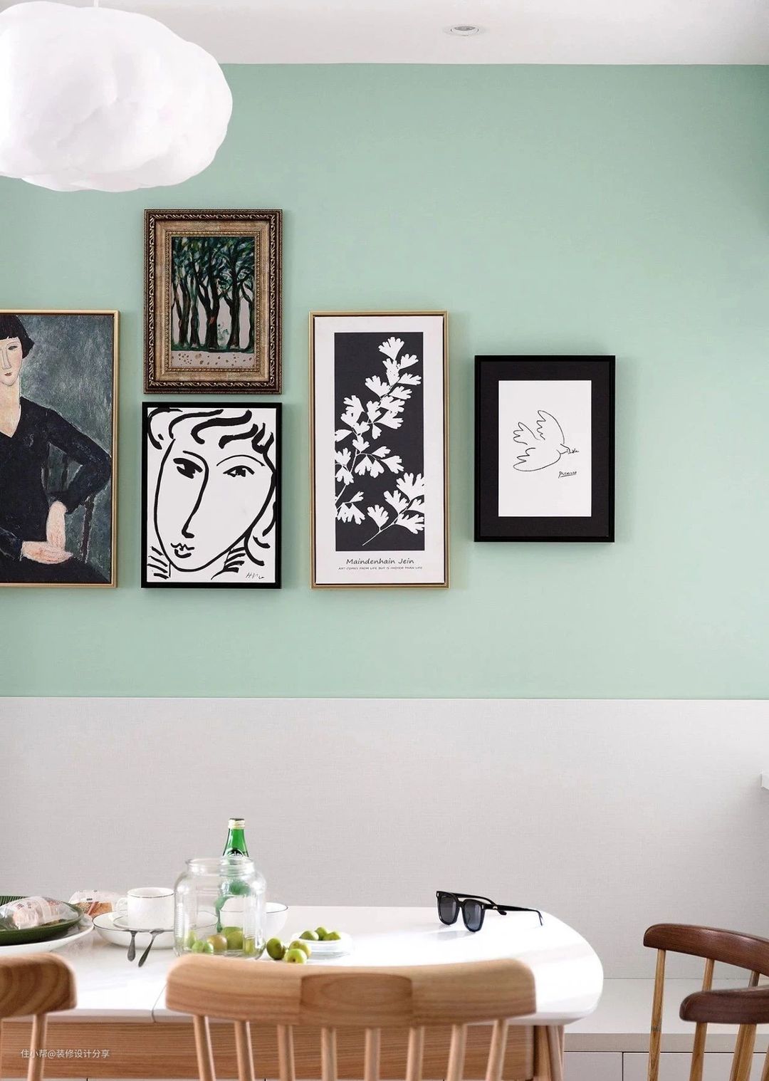 白色的卡座,搭配家具的木色元素,绿色背景墙点缀复古艺术画。