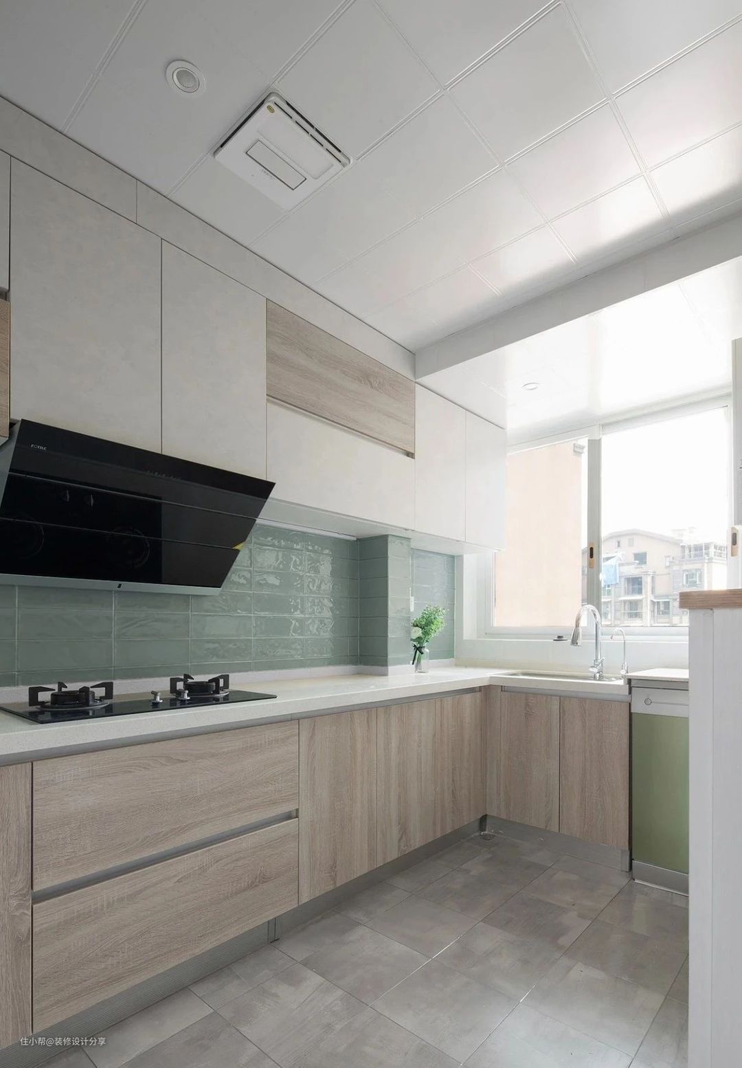厨房,水泥灰瓷砖地面搭配水蓝色墙砖,仿岩板的柜门与木皮柜门搭配,打造轻快养眼的料理空间。