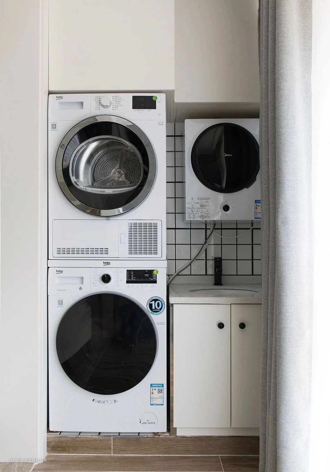 阳台洗衣房,加高地台划分场域,配置洗衣+干衣+壁挂小洗衣机。
