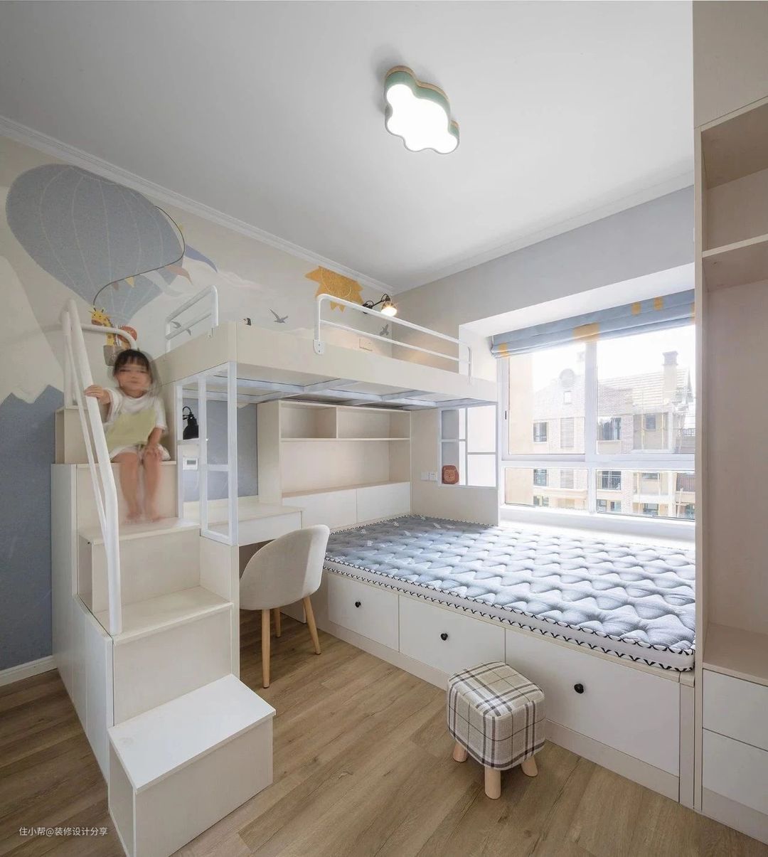 儿童房可爱梦幻,考虑到业主有二胎的可能性,选择上下床的设计,床之间纵横交错,刚好把节省的空间利用起来做一个书桌。
