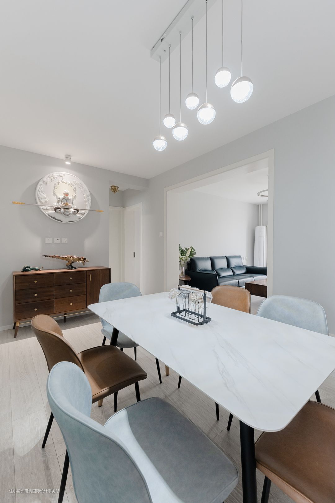 餐桌上方的吊灯成一字型错落排列,增加空间的纵深感。
