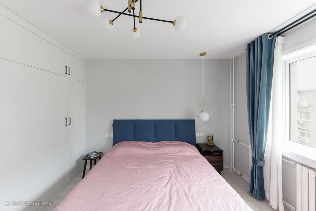 主卧同行采用了大量的留白,延续了胡桃木+蓝点缀空间,清新沉静。