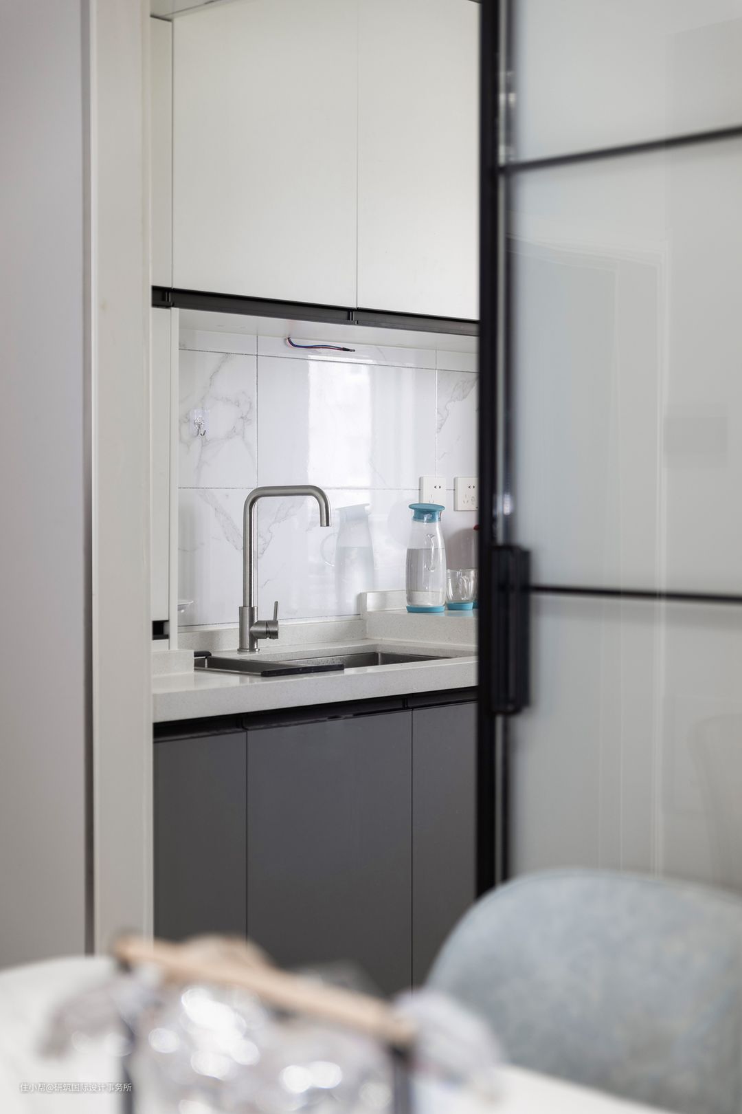 厨房采用了吊柜玻璃移门,黑色细边框的设计颜值很高。