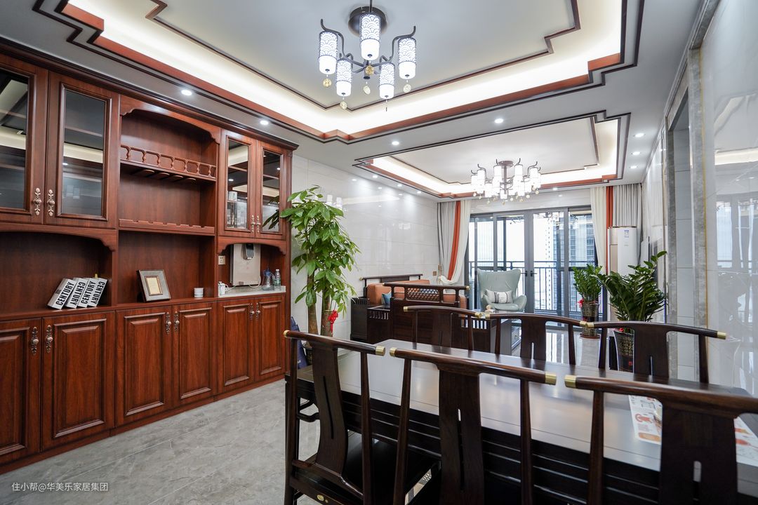 餐厅挑空吊顶的设计搭配新中式吊灯很显大气。 古色古香的方形餐桌仿古餐椅呈现出餐厅的独有韵味