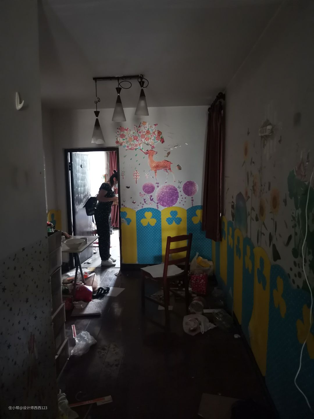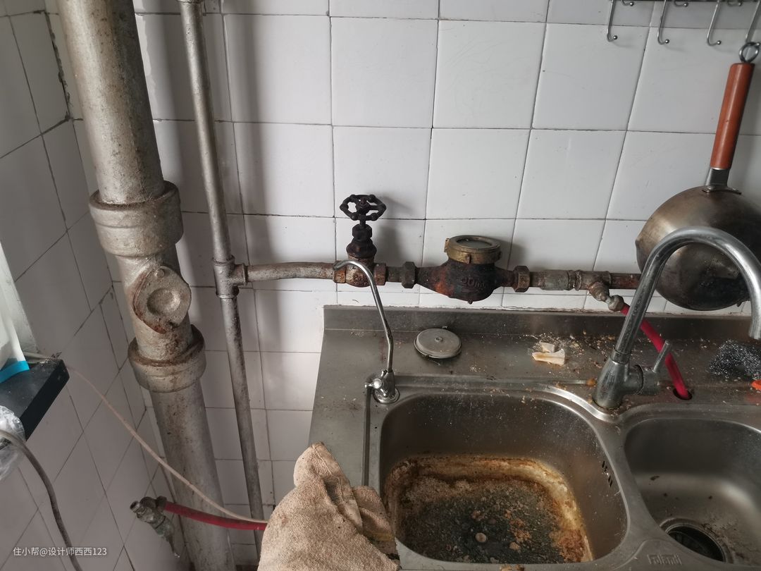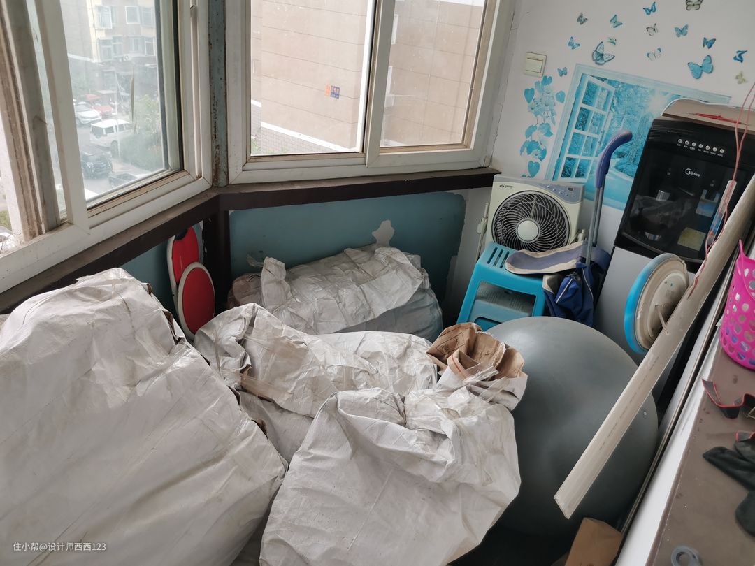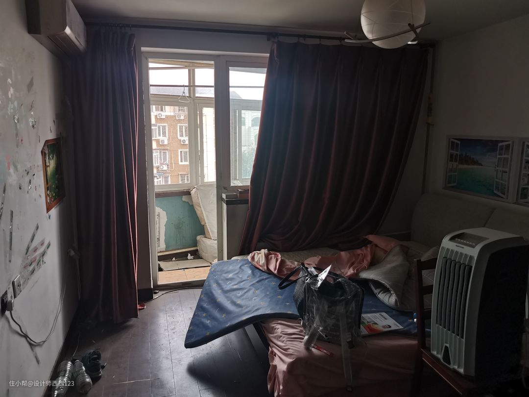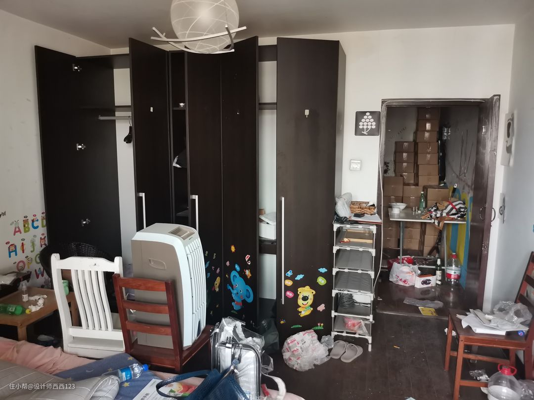 1、原户型是狭长型两室,客厅是包裹式暗厅,采光差,很多东西被胡乱丢在地上,几乎无处下脚,墙上全都是贴画,让整个空间巨丑,线路也都在墙上吊着,家里有孩子很危险的。 2、厨房设施简陋老旧,很多电线板材也随着时间的流逝老化,墙砖都贴了半截,墙面很容易脏且油腻腻的。烟道在厨房里,但燃气灶放厨房阳台了,上置型灶台,旁边连挡板都没有,炒菜弄的四周围很脏,洗菜盆腐蚀掉,包括旁边的管道,使用感好差。 3、卫生间干区地板都坏了,小柱盆感觉一使劲儿就坏了,洗漱很容易弄一地水,没储物还显脏乱,暗卫使用起来不舒服,湿区管道都暴露着不安全。 4、主卧空间咖色的地板和柜体会让空间显压抑,墙上也是一堆墙画和贴纸,很脏乱,阳台更是摆一堆东西,还有个10公分的地台,次卧空间也是如此,整个家住起来好难受啊。