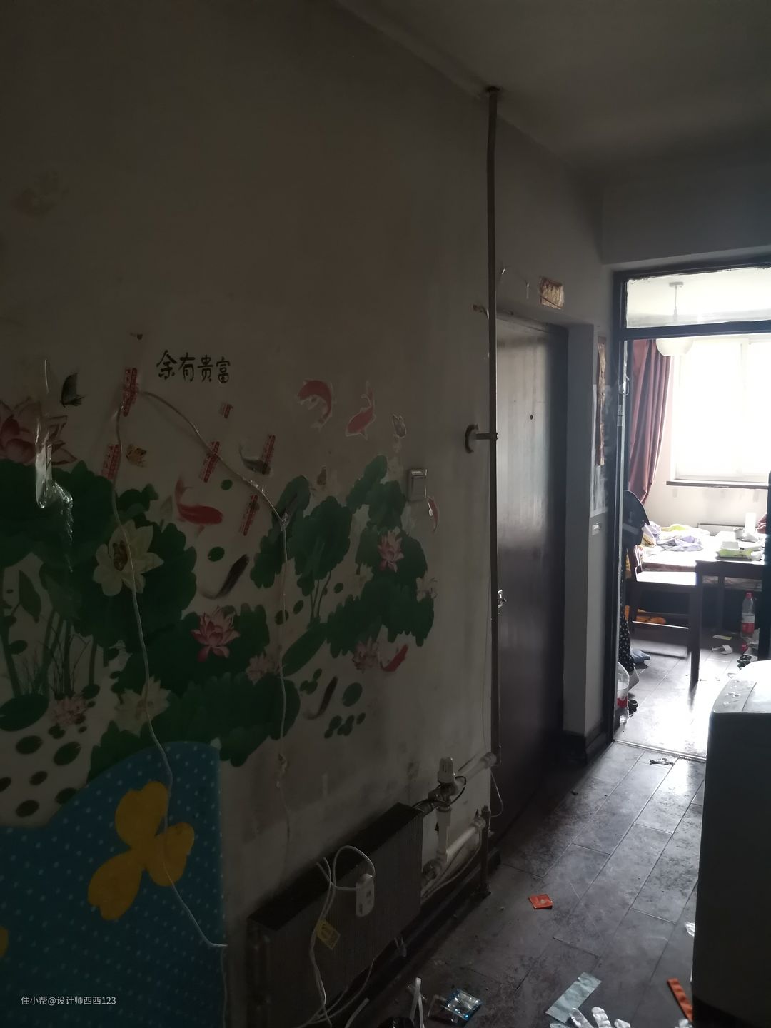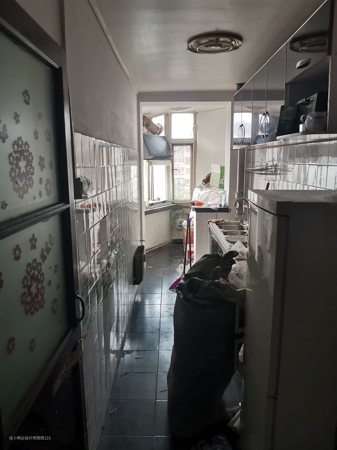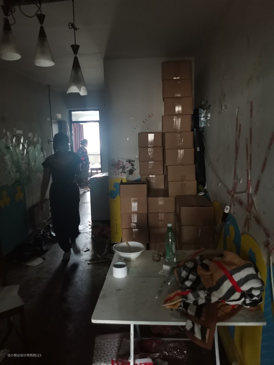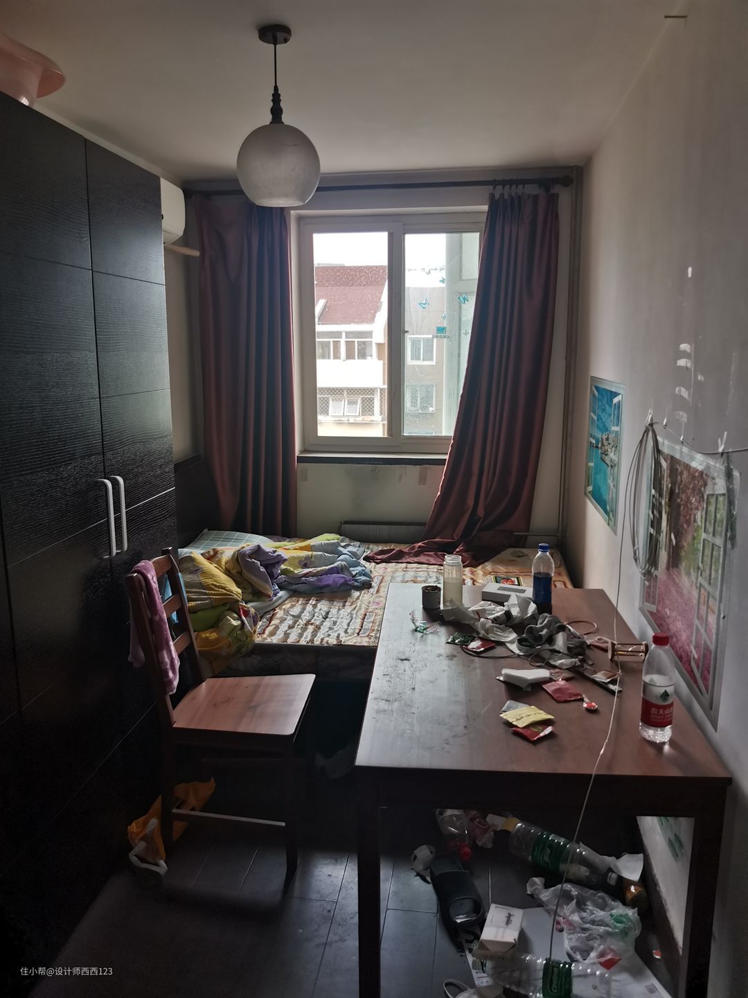1、原户型是狭长型两室,客厅是包裹式暗厅,采光差,很多东西被胡乱丢在地上,几乎无处下脚,墙上全都是贴画,让整个空间巨丑,线路也都在墙上吊着,家里有孩子很危险的。 2、厨房设施简陋老旧,很多电线板材也随着时间的流逝老化,墙砖都贴了半截,墙面很容易脏且油腻腻的。烟道在厨房里,但燃气灶放厨房阳台了,上置型灶台,旁边连挡板都没有,炒菜弄的四周围很脏,洗菜盆腐蚀掉,包括旁边的管道,使用感好差。 3、卫生间干区地板都坏了,小柱盆感觉一使劲儿就坏了,洗漱很容易弄一地水,没储物还显脏乱,暗卫使用起来不舒服,湿区管道都暴露着不安全。 4、主卧空间咖色的地板和柜体会让空间显压抑,墙上也是一堆墙画和贴纸,很脏乱,阳台更是摆一堆东西,还有个10公分的地台,次卧空间也是如此,整个家住起来好难受啊。