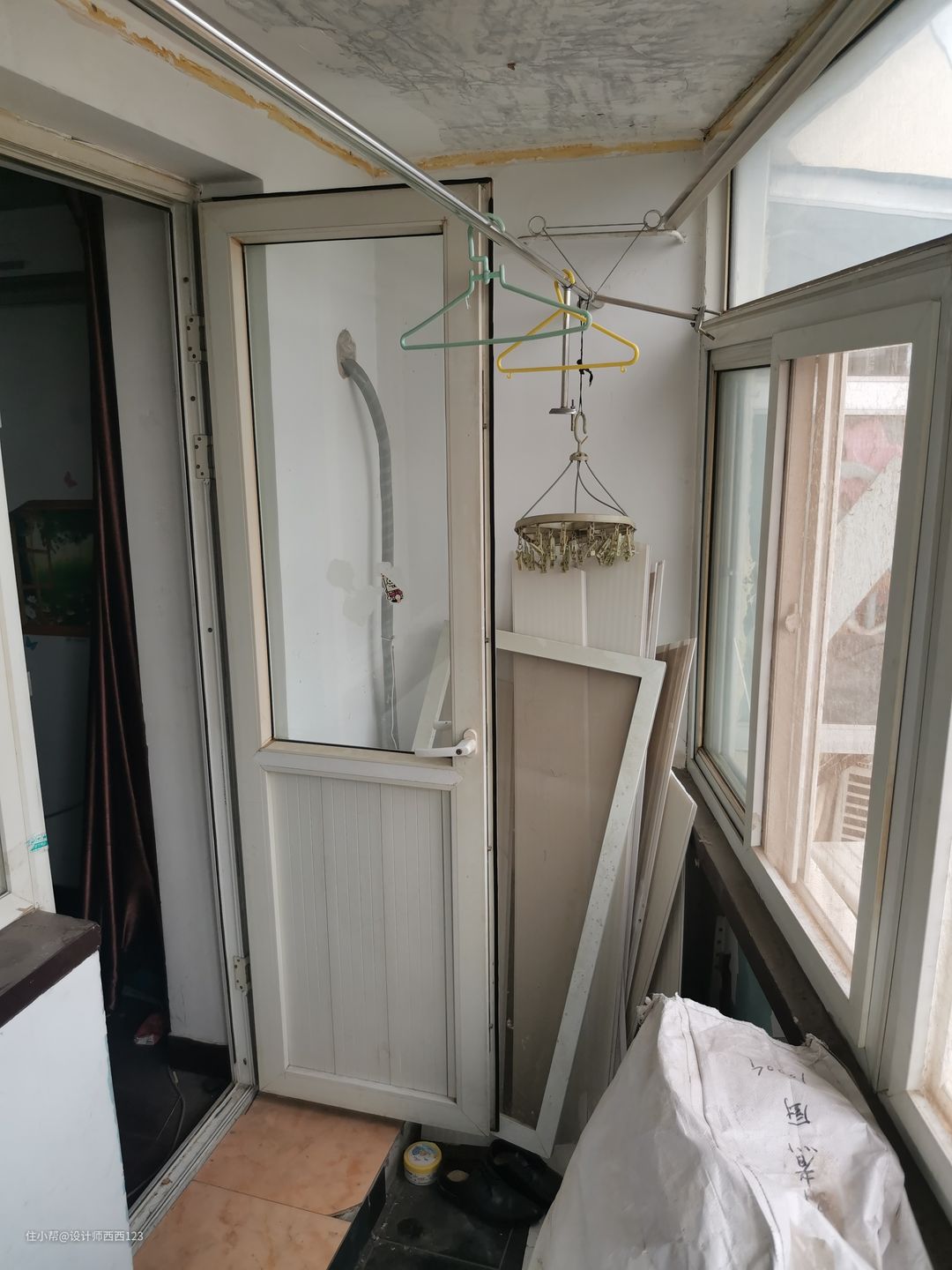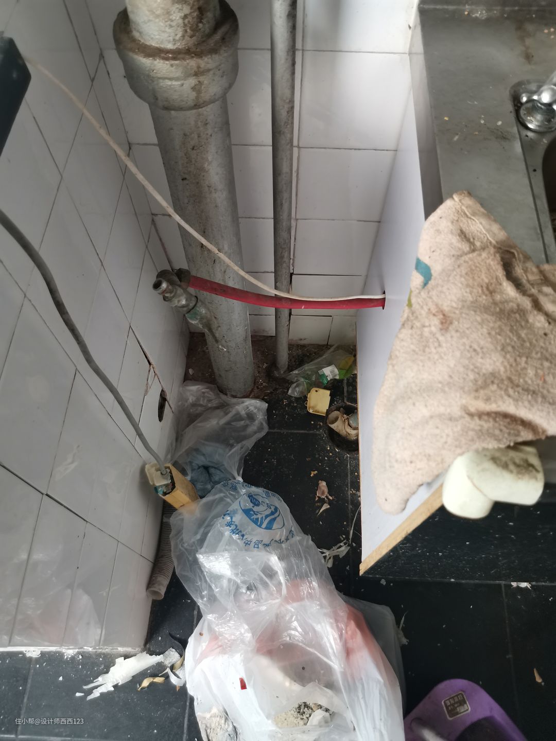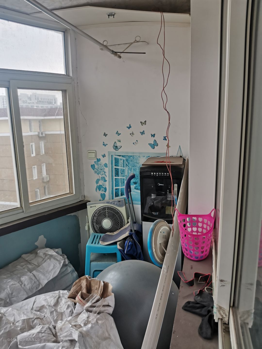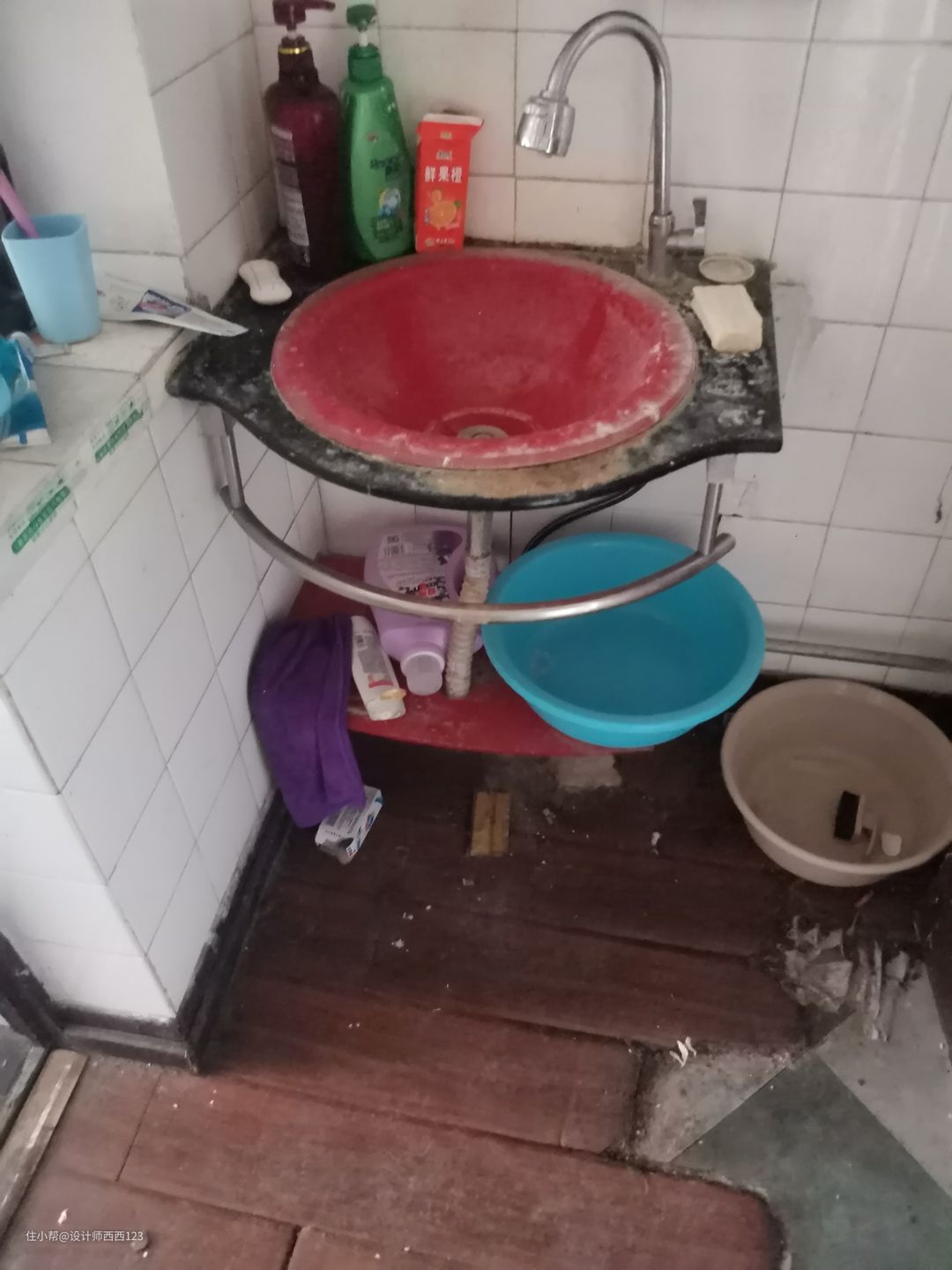 1、原户型是狭长型两室,客厅是包裹式暗厅,采光差,很多东西被胡乱丢在地上,几乎无处下脚,墙上全都是贴画,让整个空间巨丑,线路也都在墙上吊着,家里有孩子很危险的。 2、厨房设施简陋老旧,很多电线板材也随着时间的流逝老化,墙砖都贴了半截,墙面很容易脏且油腻腻的。烟道在厨房里,但燃气灶放厨房阳台了,上置型灶台,旁边连挡板都没有,炒菜弄的四周围很脏,洗菜盆腐蚀掉,包括旁边的管道,使用感好差。 3、卫生间干区地板都坏了,小柱盆感觉一使劲儿就坏了,洗漱很容易弄一地水,没储物还显脏乱,暗卫使用起来不舒服,湿区管道都暴露着不安全。 4、主卧空间咖色的地板和柜体会让空间显压抑,墙上也是一堆墙画和贴纸,很脏乱,阳台更是摆一堆东西,还有个10公分的地台,次卧空间也是如此,整个家住起来好难受啊。