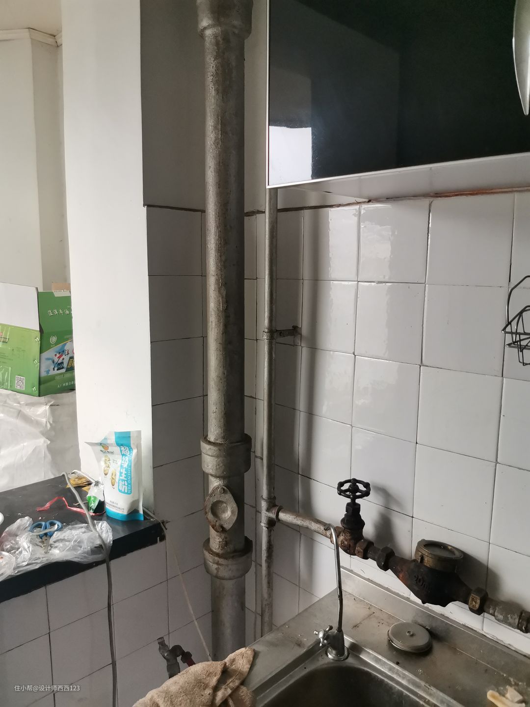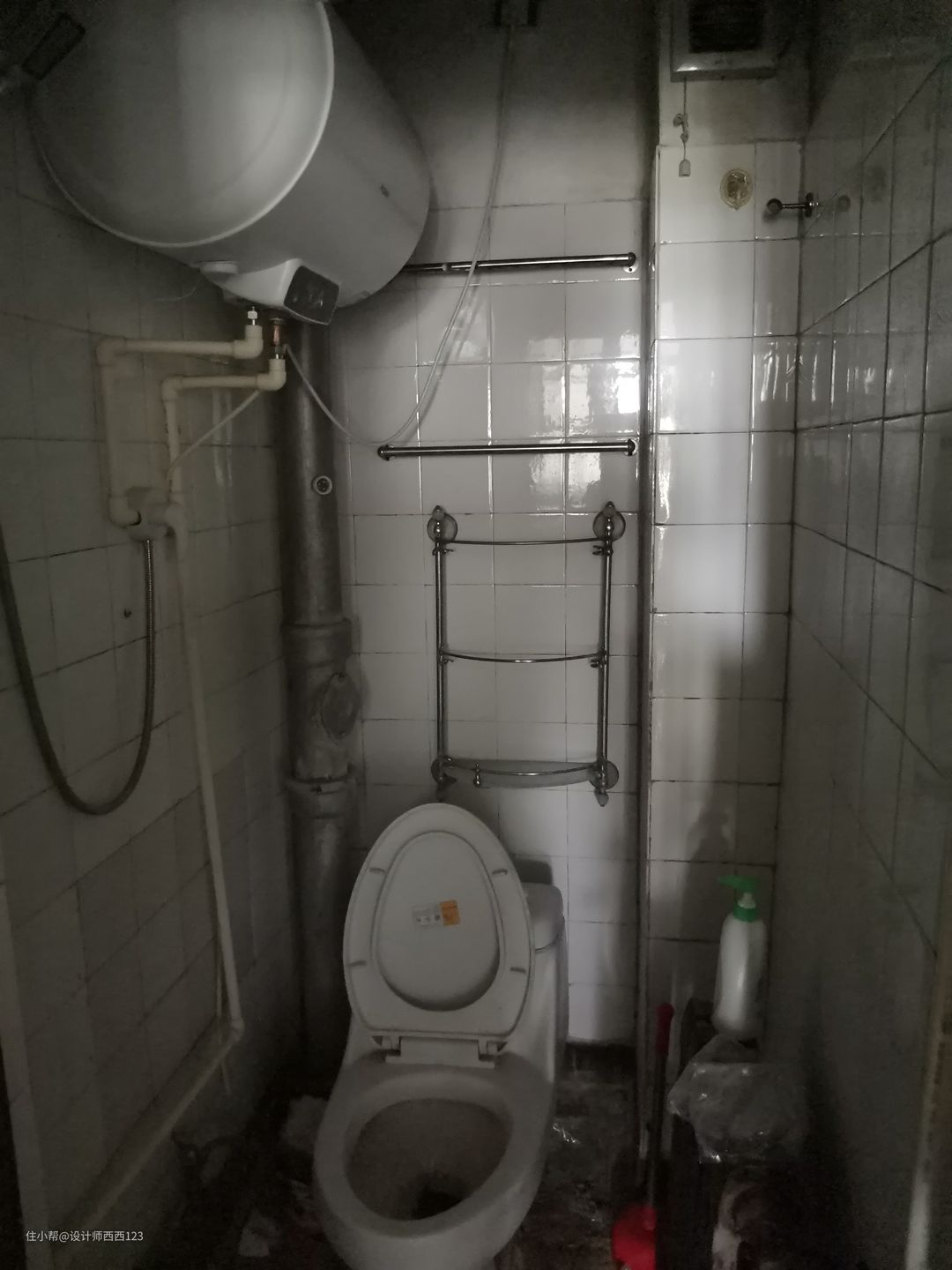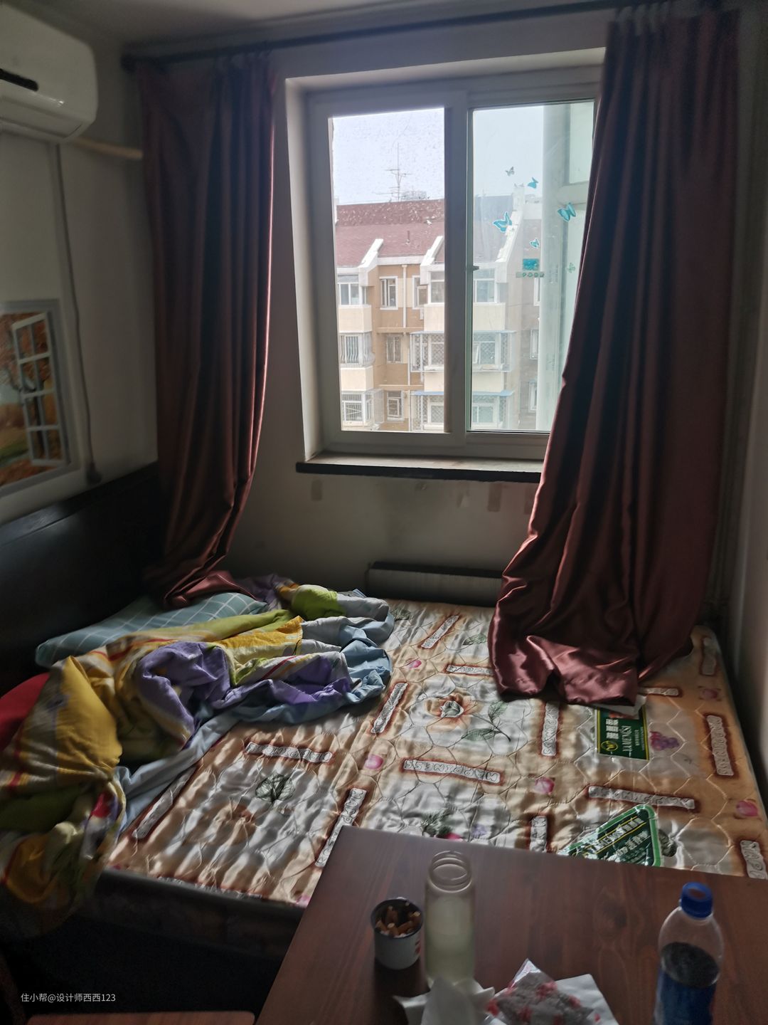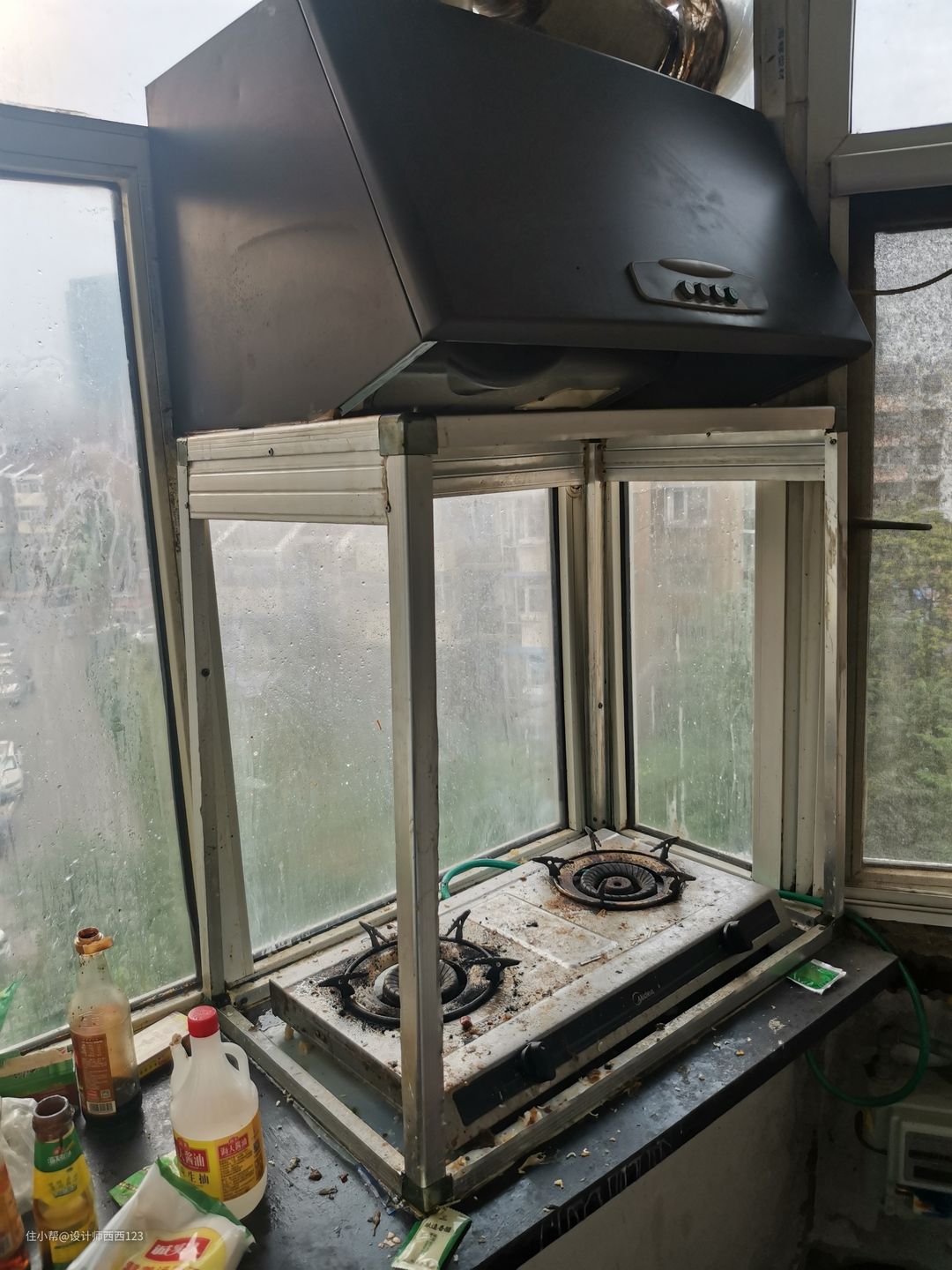 1、原户型是狭长型两室,客厅是包裹式暗厅,采光差,很多东西被胡乱丢在地上,几乎无处下脚,墙上全都是贴画,让整个空间巨丑,线路也都在墙上吊着,家里有孩子很危险的。 2、厨房设施简陋老旧,很多电线板材也随着时间的流逝老化,墙砖都贴了半截,墙面很容易脏且油腻腻的。烟道在厨房里,但燃气灶放厨房阳台了,上置型灶台,旁边连挡板都没有,炒菜弄的四周围很脏,洗菜盆腐蚀掉,包括旁边的管道,使用感好差。 3、卫生间干区地板都坏了,小柱盆感觉一使劲儿就坏了,洗漱很容易弄一地水,没储物还显脏乱,暗卫使用起来不舒服,湿区管道都暴露着不安全。 4、主卧空间咖色的地板和柜体会让空间显压抑,墙上也是一堆墙画和贴纸,很脏乱,阳台更是摆一堆东西,还有个10公分的地台,次卧空间也是如此,整个家住起来好难受啊。