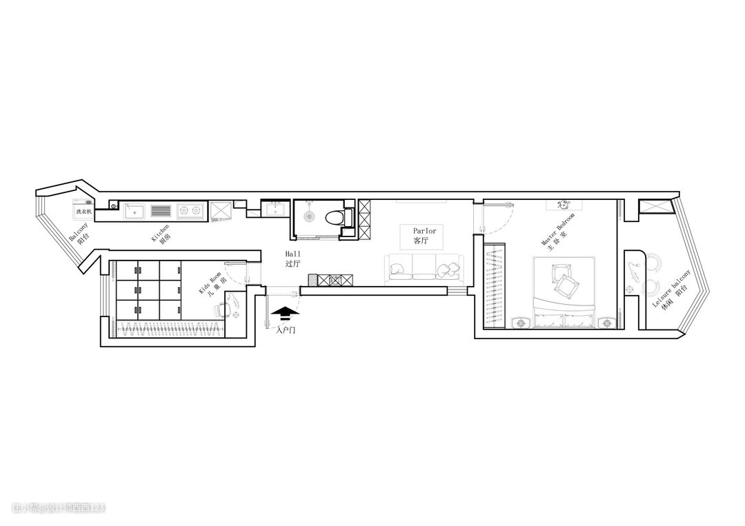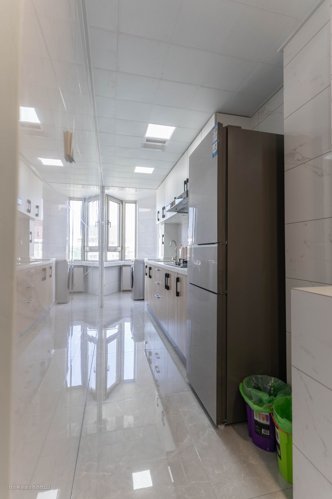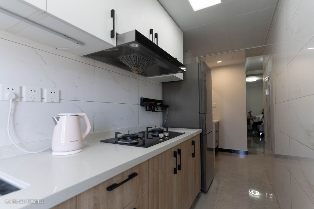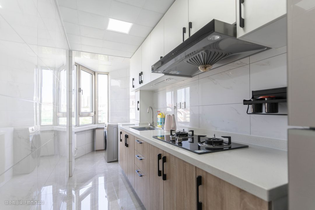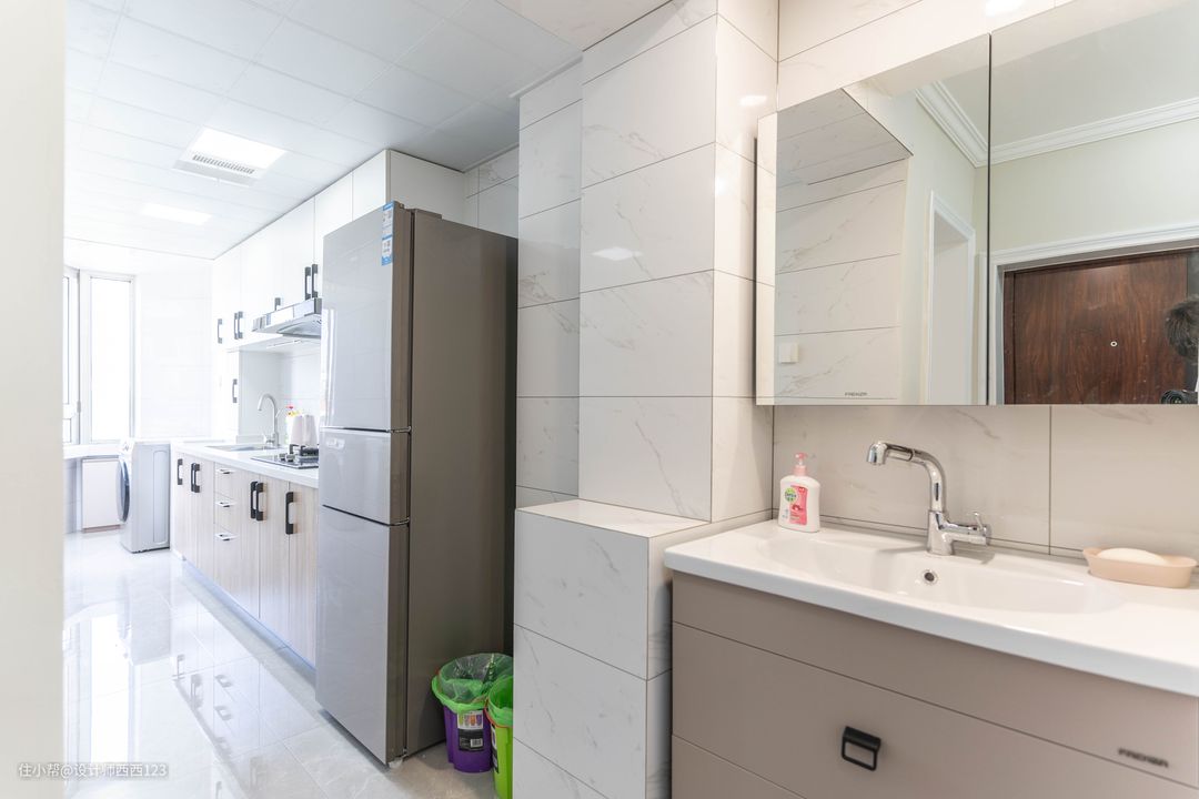 厨房重新调整布局,把炉灶挪进来,冰箱、橱柜一字排开,整齐好用,原来的阳台,变身洗衣区,挨着厨房,上下水比较好解决。