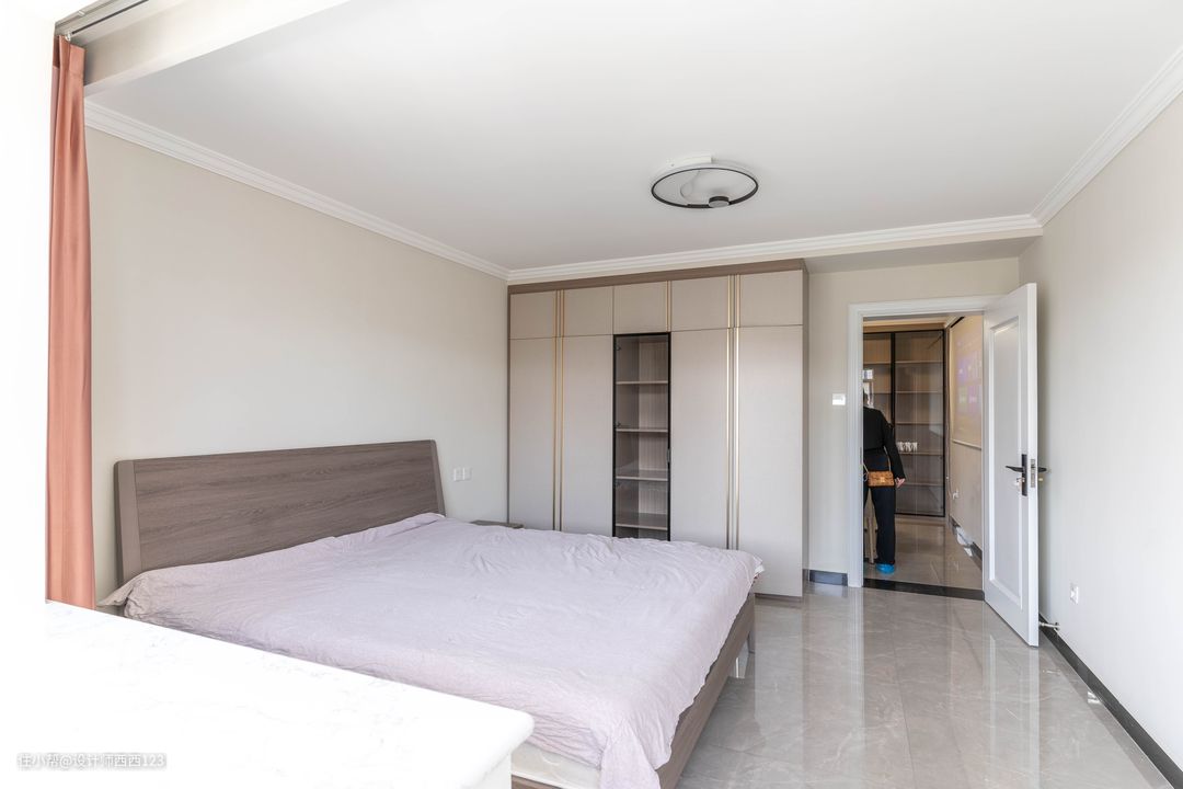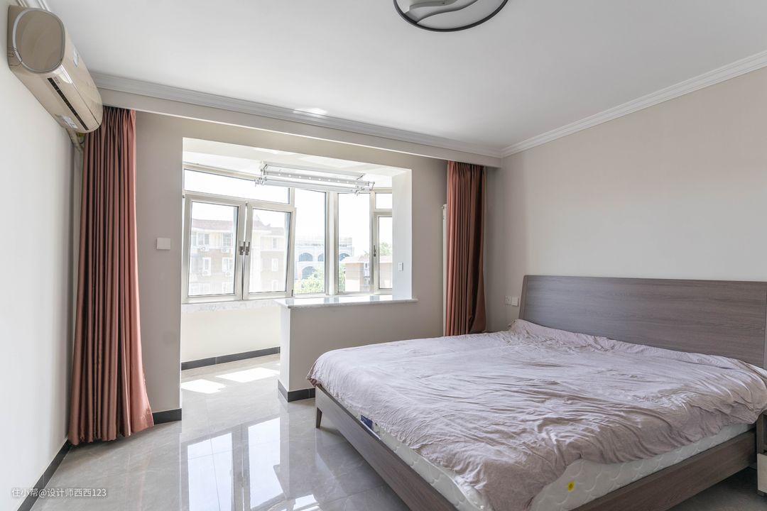 主卧非常的舒适宽敞,做了通顶的储物柜,让收纳最大化,阳台10公分的地台填充和卧室空间一般高低,使用感最佳,因为夫妻俩偶尔要在家办公,阳台加宽设置了个吧台,闲暇时坐在这里晒太阳、喝茶小憩,惬意极了。