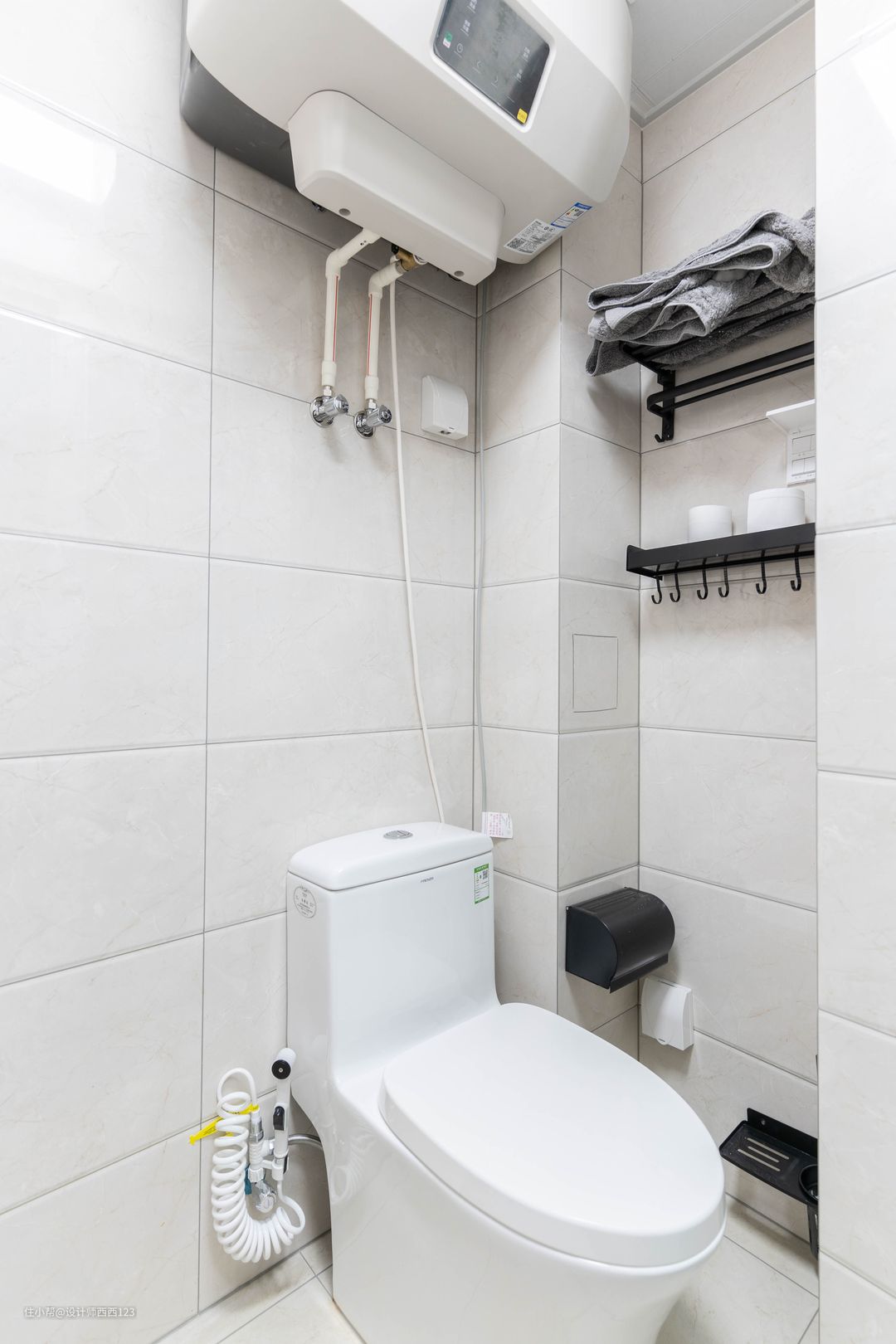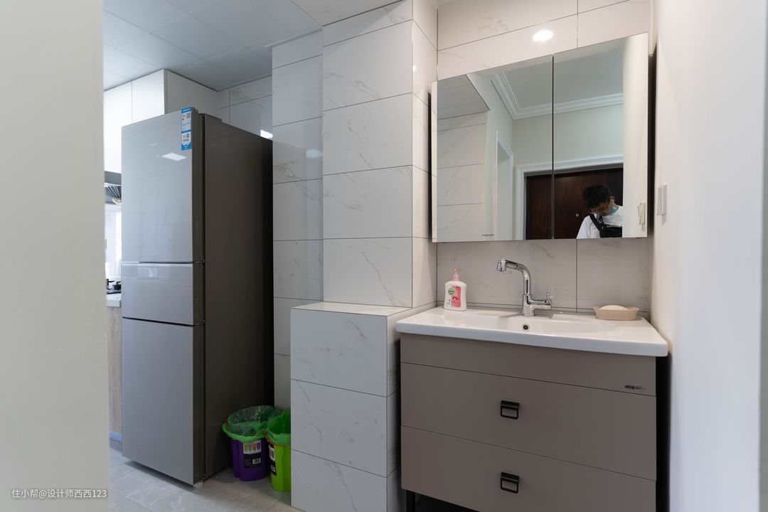 卫生间原来就是干湿分区,封闭卫生间原始门洞,避免正对厨房的尴尬,调整走位动线后更合理,主卧和客厅来卫生间也不用拐弯,磨砂玻璃推拉门,不影响采光,干净利落占地少,使用起来也更舒服。