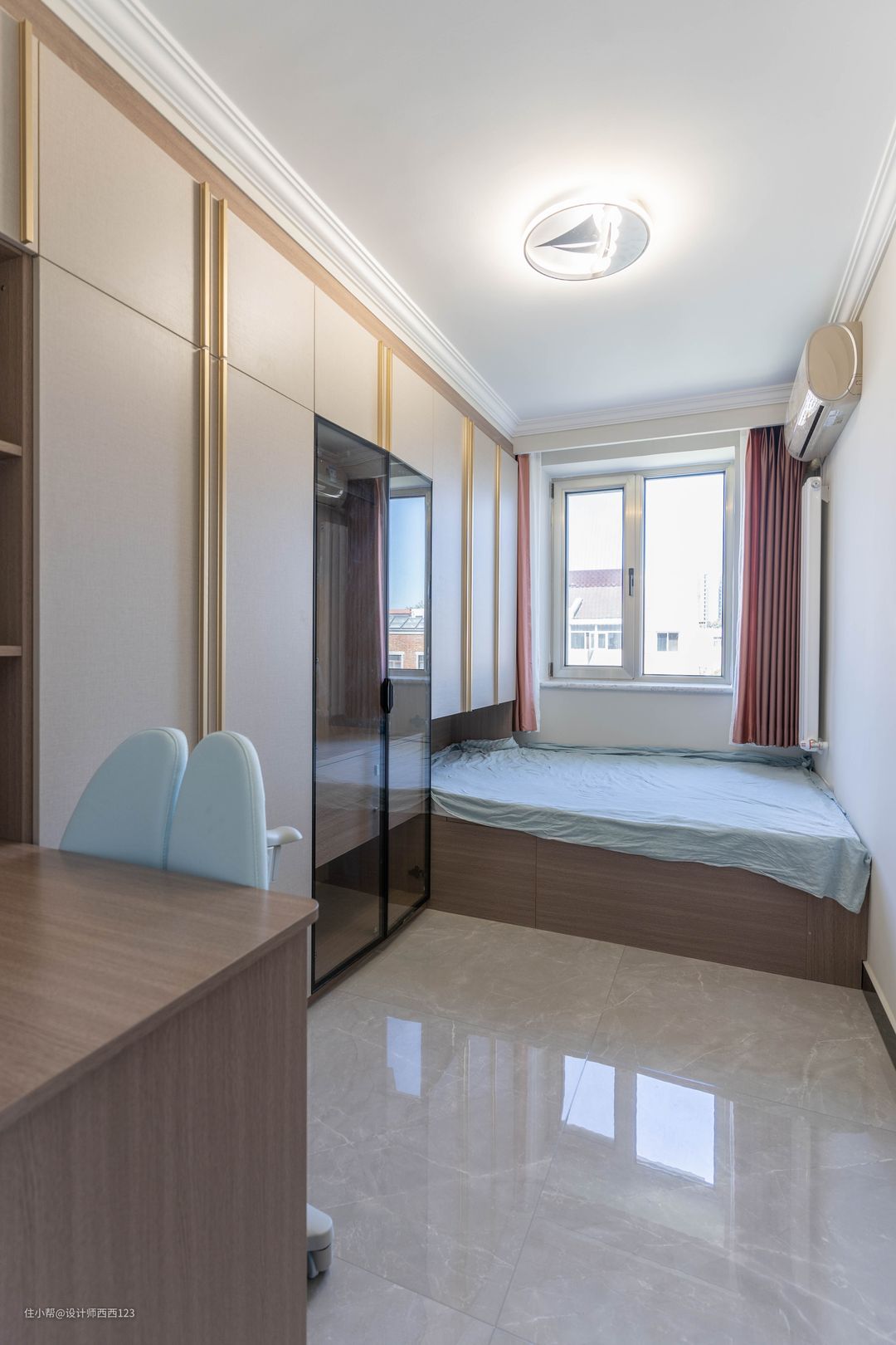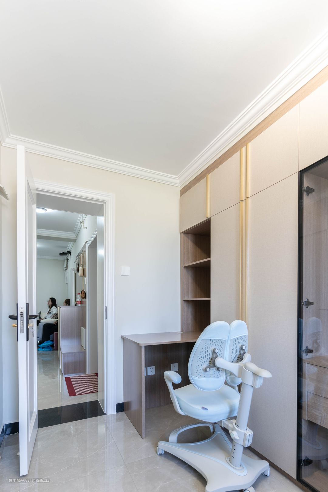 进门左侧是次卧,为了有更多的收纳,做成了榻榻米衣柜书桌的定制,全部换成浅色的柜体和墙面,让整个屋子更舒适。