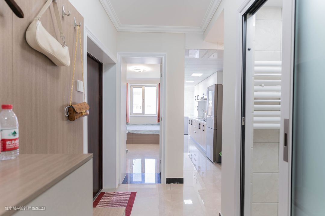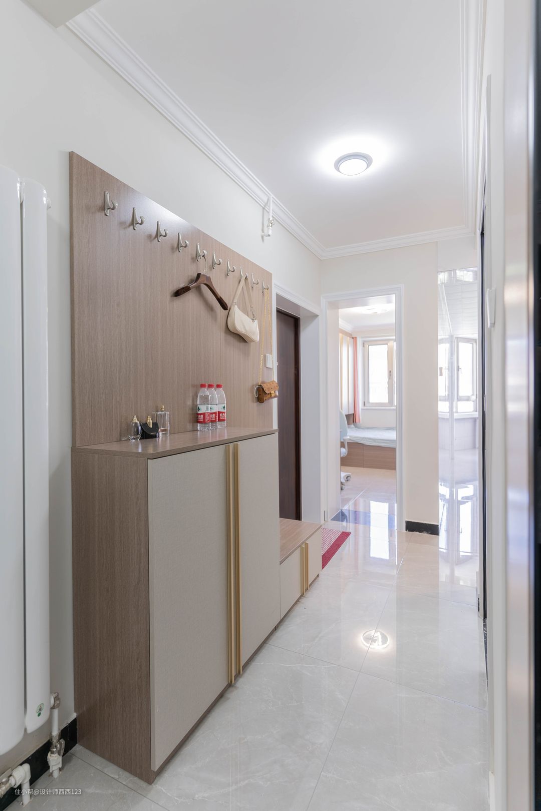 进门右手边是一个玄关柜,满足屋主一家三口日常换鞋、放包、挂衣、储物的需求。