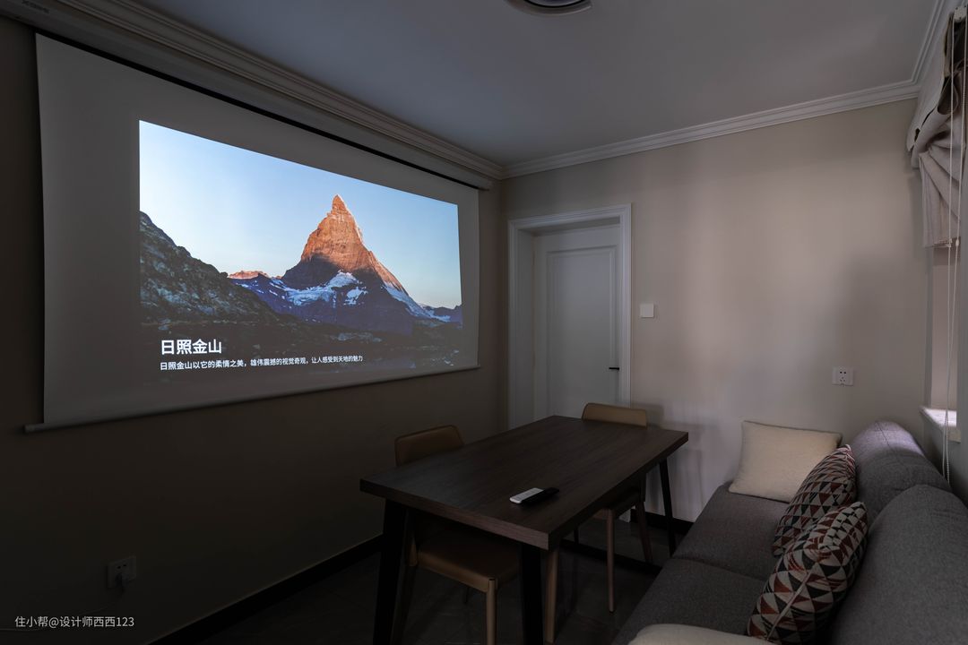 客厅空间不大,兼顾餐厅,尽可能的榨取每一寸空间,直接做投影幕布,比电视亮度更柔和,不刺伤眼睛,旁边还有到顶的储物柜,保证公区的收纳,这个空间扮演了客厅餐厅2个角色。