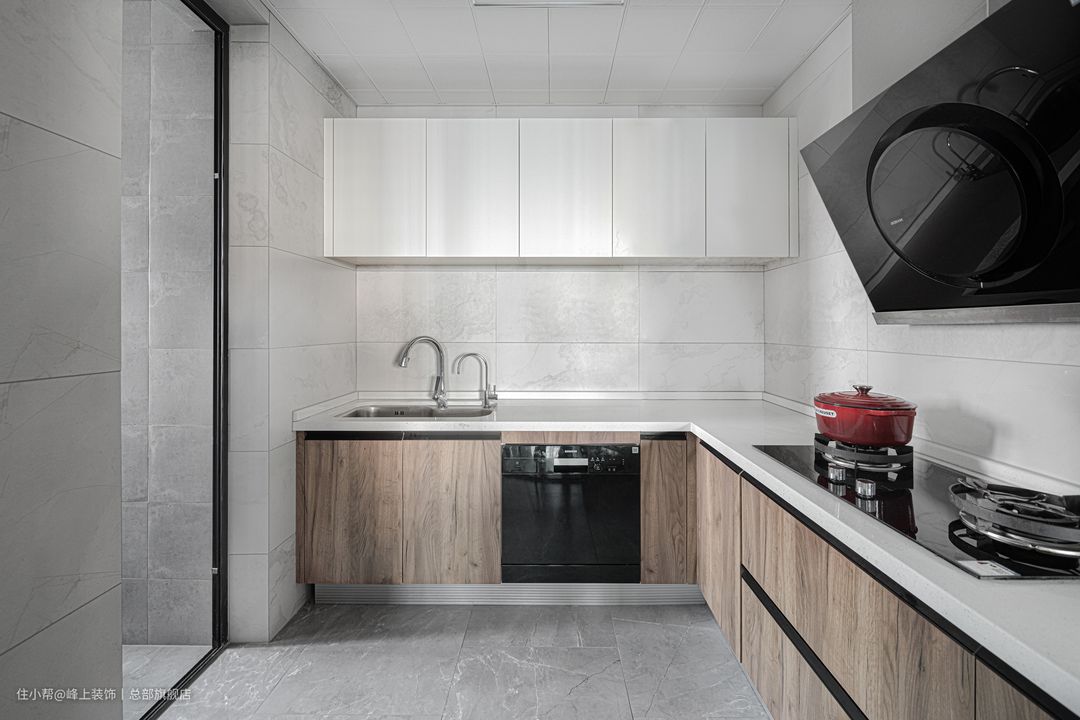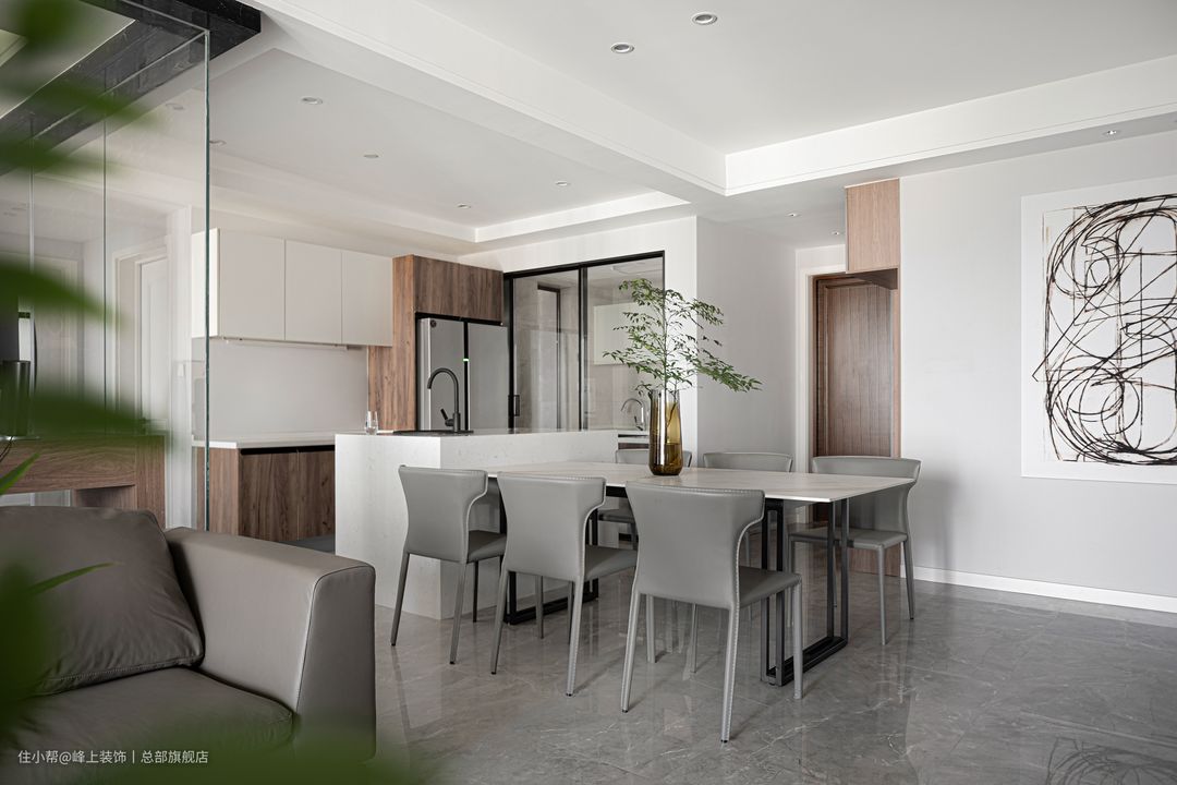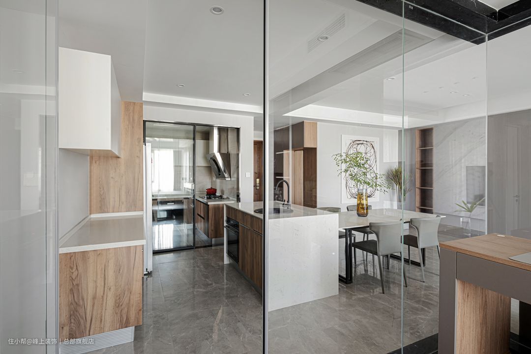 玻璃推拉门后是他们制作美食的中厨区域,白、灰、原木色依然是空间的基调,在充足光线的调和下,呈现出柔和且富有层次的美感。上下整排2.36m+3.49m的大容量橱柜,完全可以使得厨房不会被一丝杂乱打扰气氛。