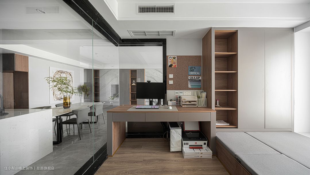 本案考虑到女屋主在家办公的重要需求,我们重点将书房进行改造。为了让她在工作的同时既能感受家的温暖不显寂寞,又能独立不受影响。而男屋主休息在家时也能透过玻璃看到正在工作时对方的侧脸时,也会感到幸福与安心。