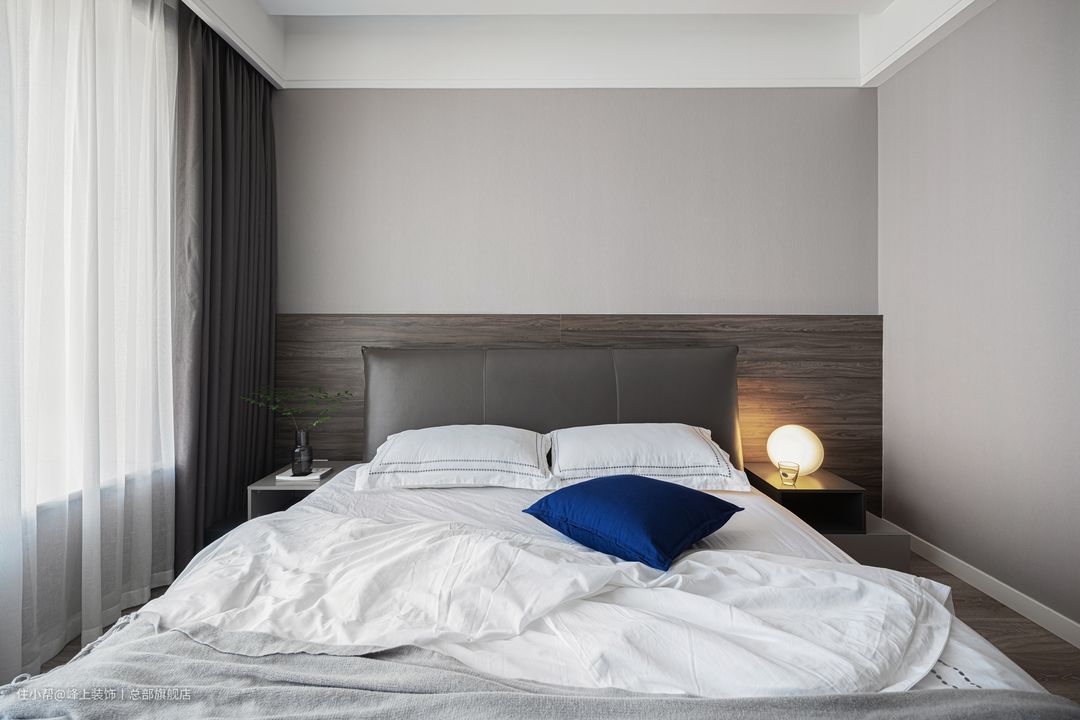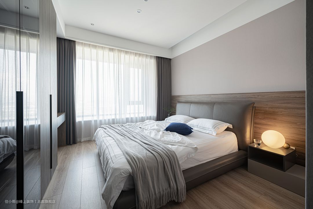 卧室空间呈现如公共区域同种材质,冷静的灰调搭配温润的木色。透过纱帘递进来的光让空气中仿佛充满淡淡的白色浮粒,让居住者体验到一种温柔的魔力。