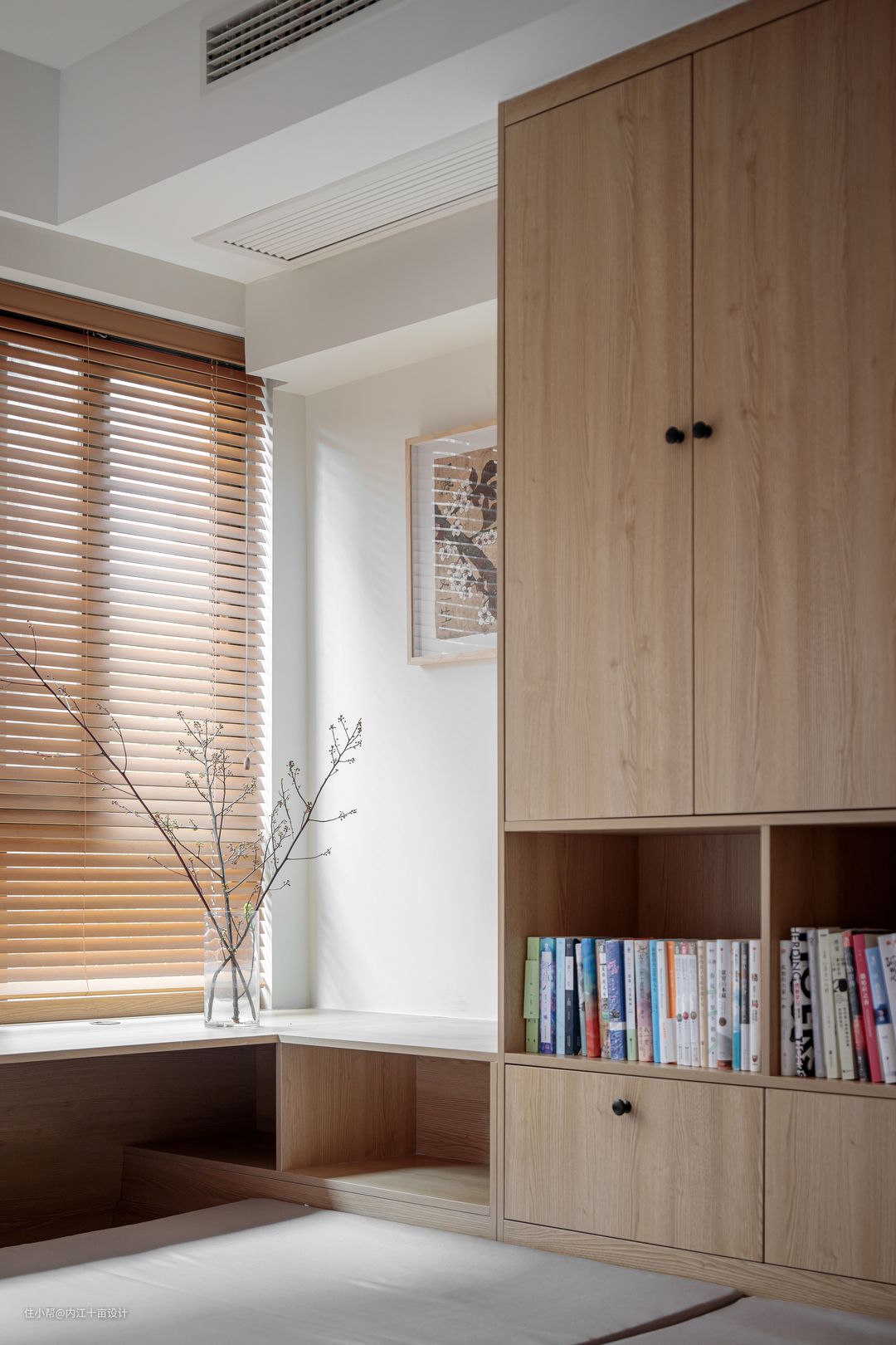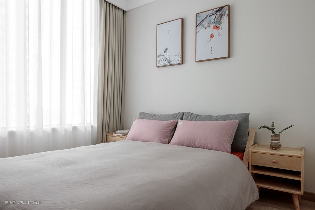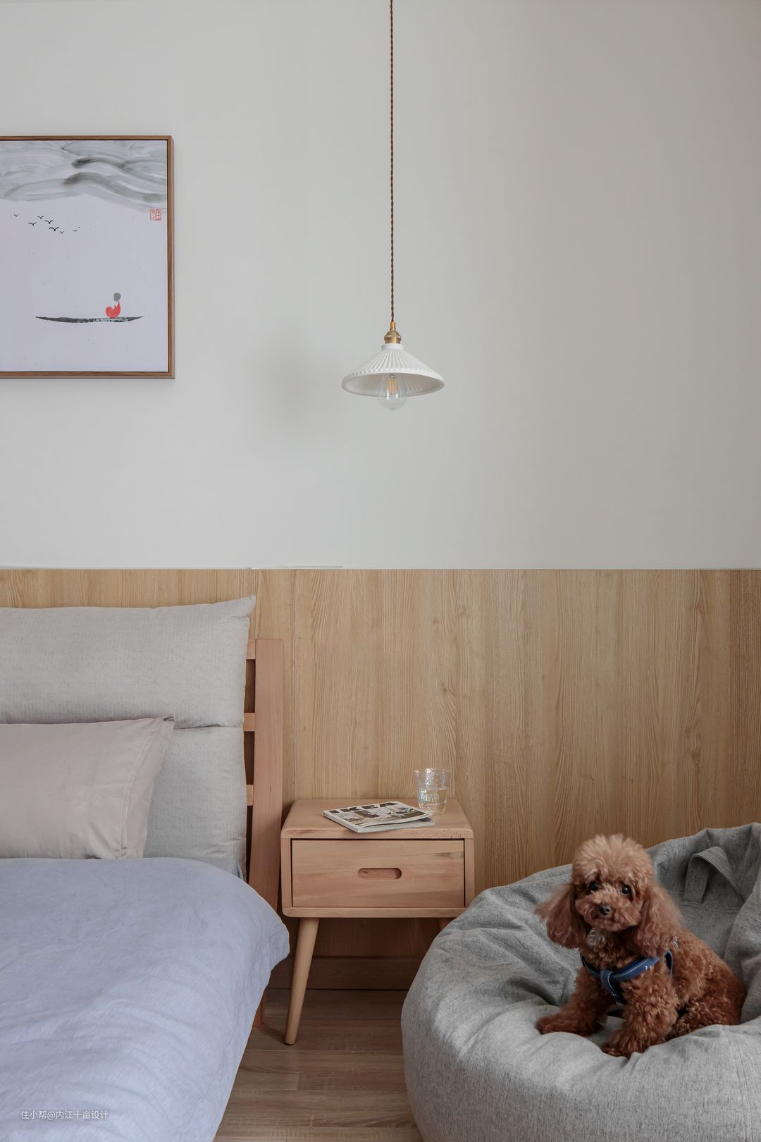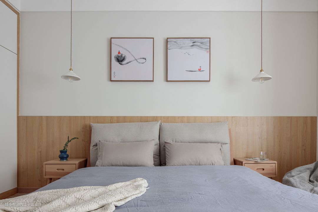 主卧延续简约格调,木饰面半高护墙结合浅色背景,点缀禅意挂画与百褶吊灯,温润而优雅