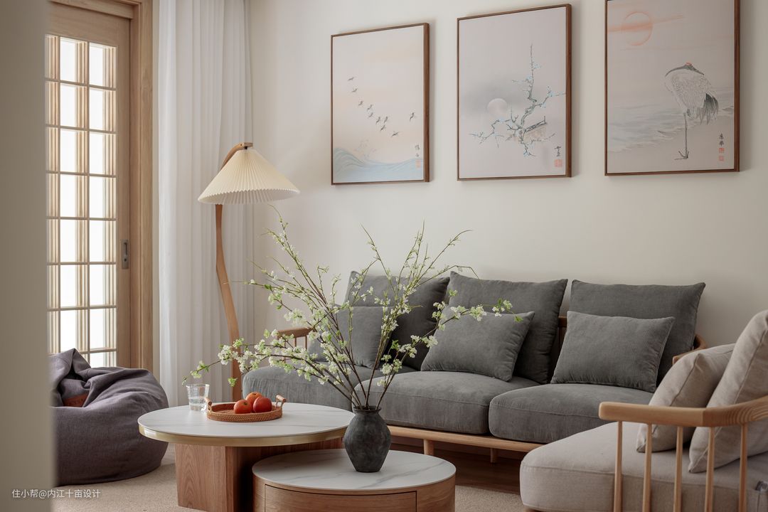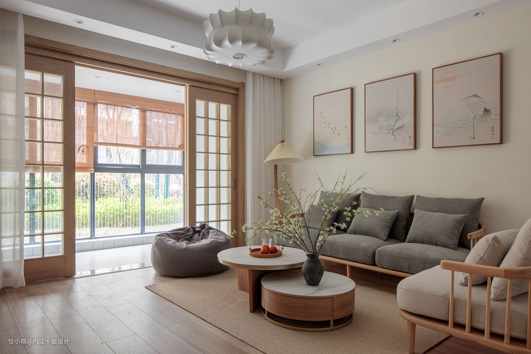 客厅与阳台选用网格木色推拉门隔断,既有颜值,又富有韵味
