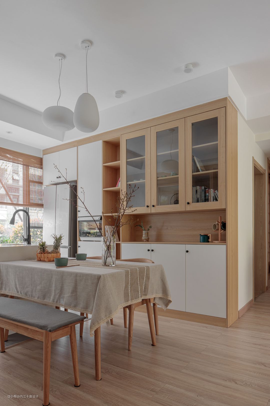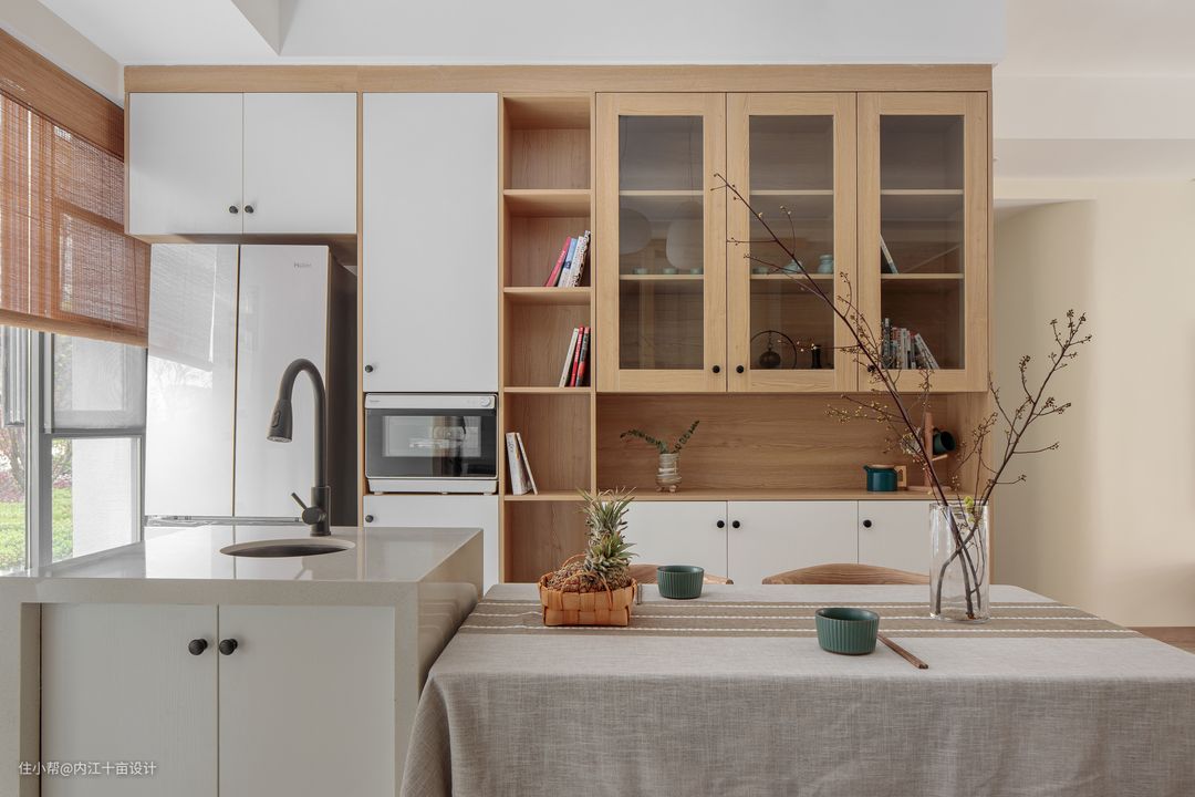 餐厅背景做了整面餐边柜,纳入冰箱与烤箱,美观与实用并存
