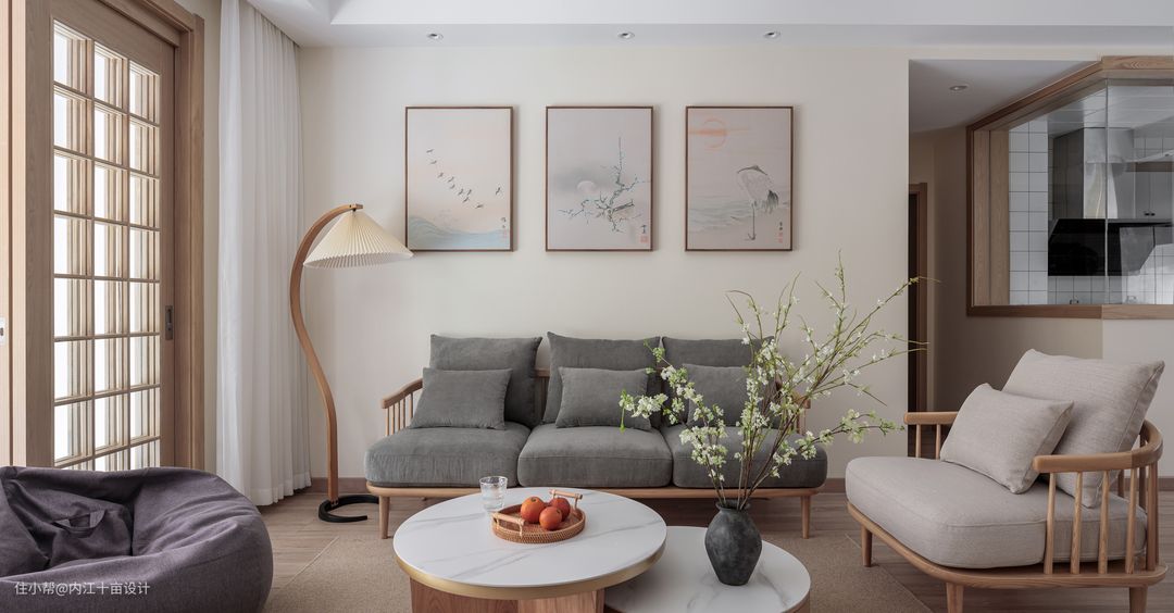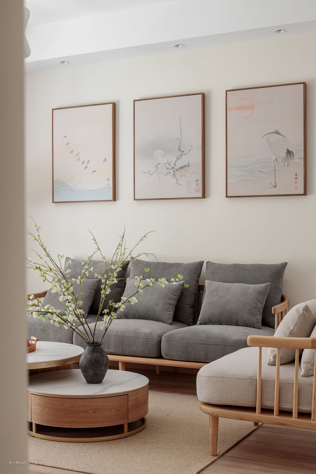 实木家具造型别致、线条柔和,低饱和背景点缀禅意挂画组更显简洁素雅