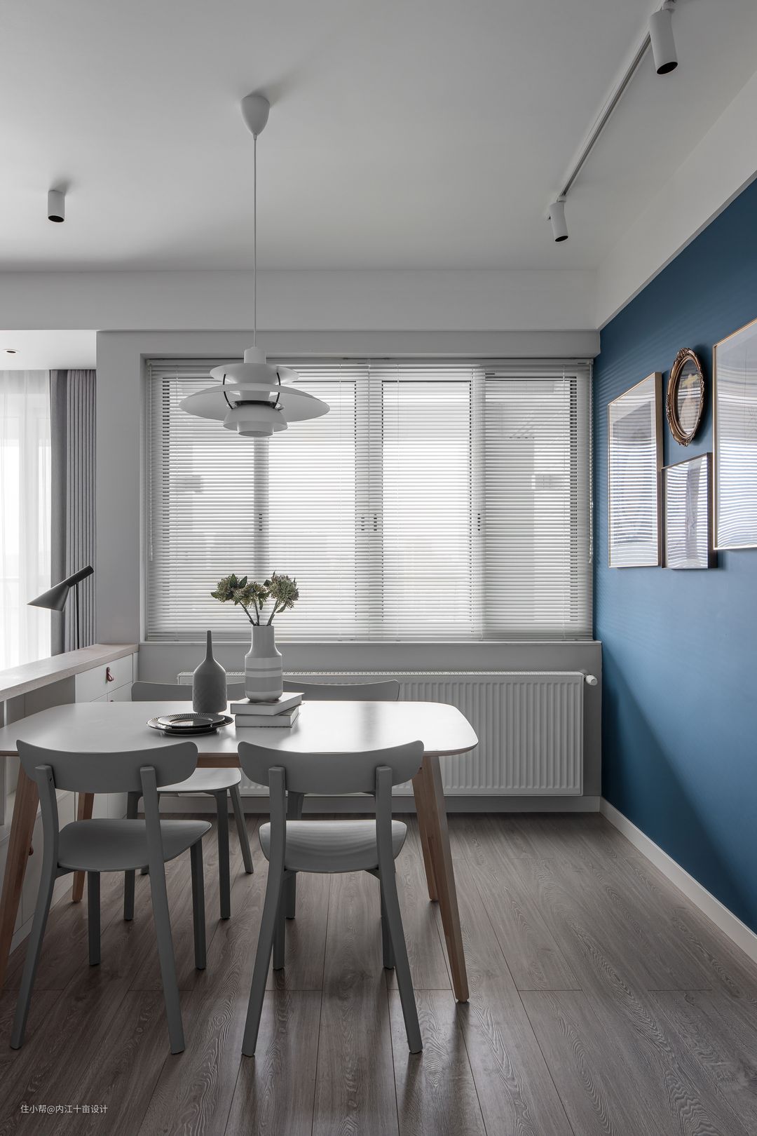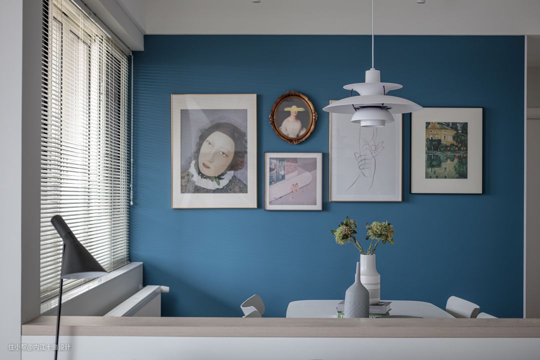 餐厅,北欧风餐桌椅搭配现代吊灯,蓝色背景墙修饰复古装饰画