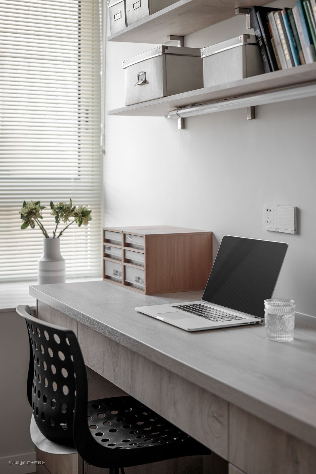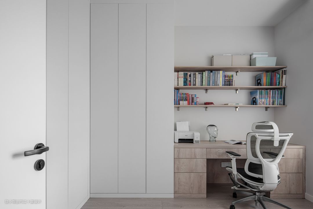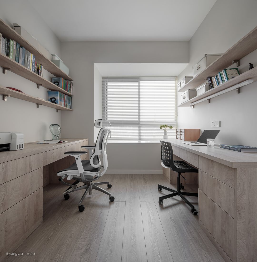 书房,两边靠墙打造书桌,满足男女主人同时办公、看书,利用立面设计隔板充当书架功能