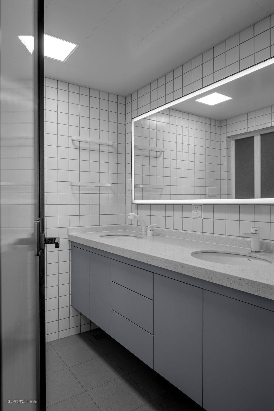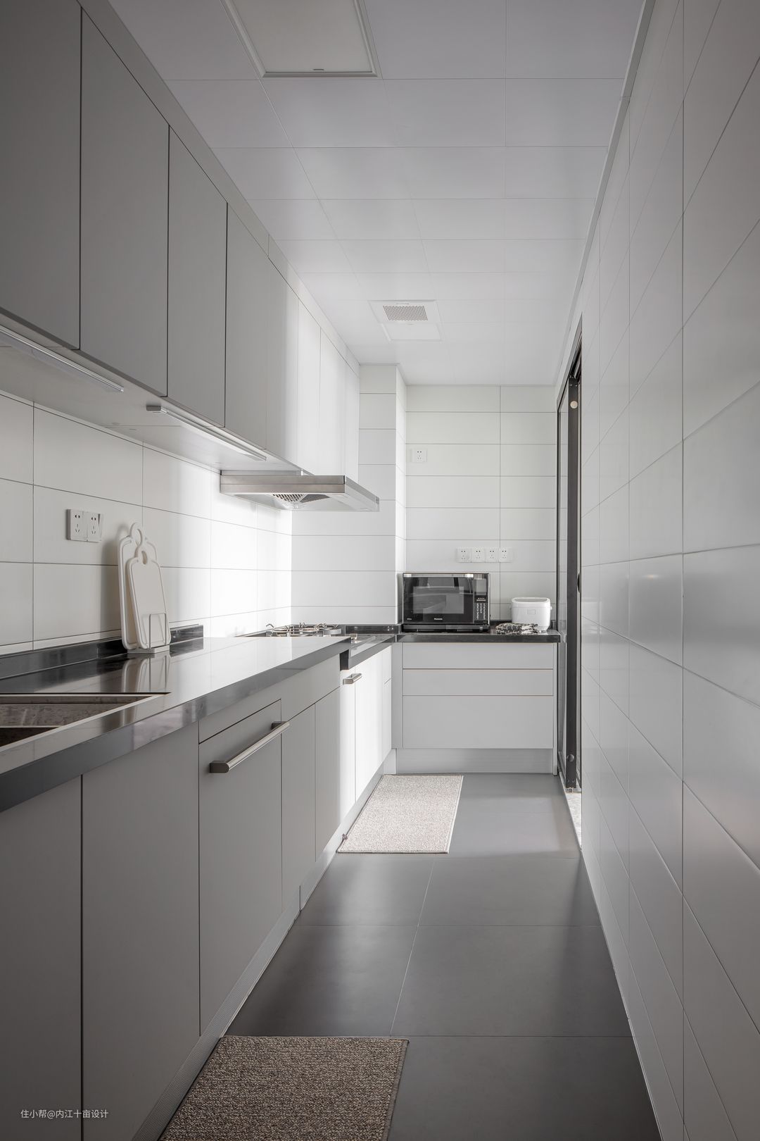 厨房L型布局,白色的橱柜与墙砖更显干净利落,错落台面设计提高烹饪舒适度