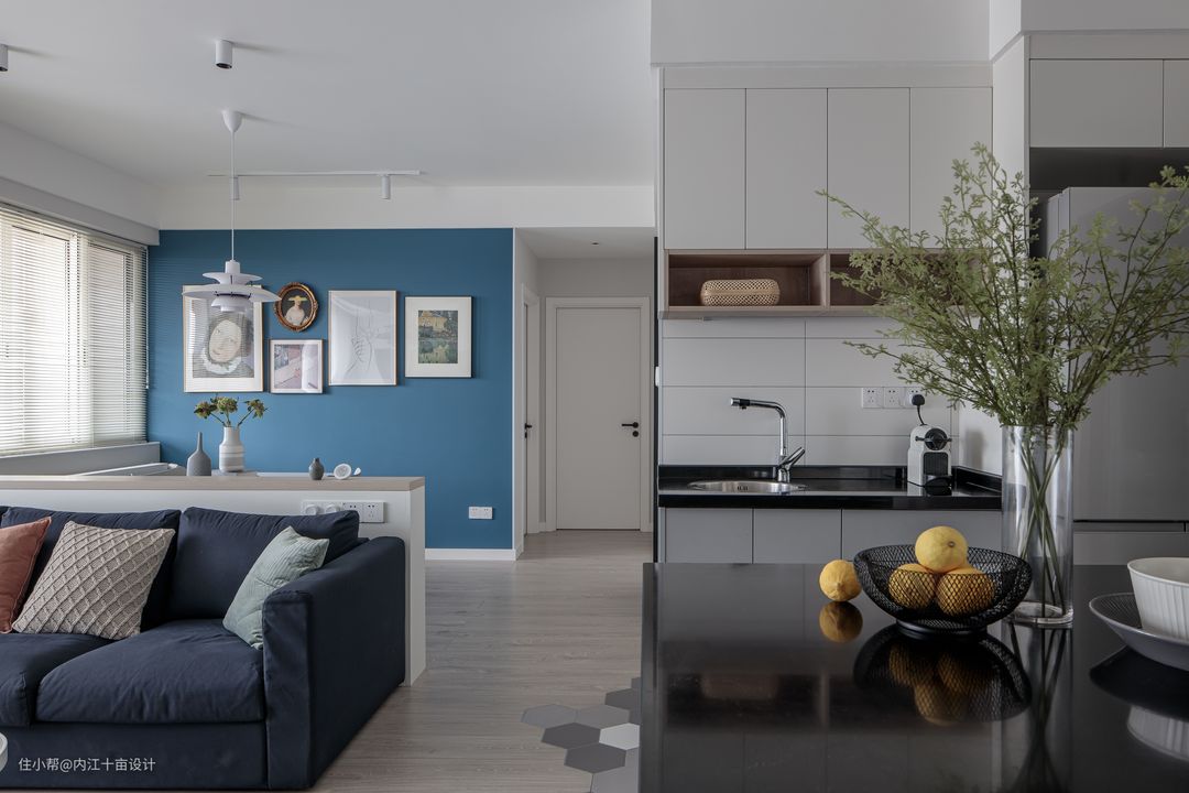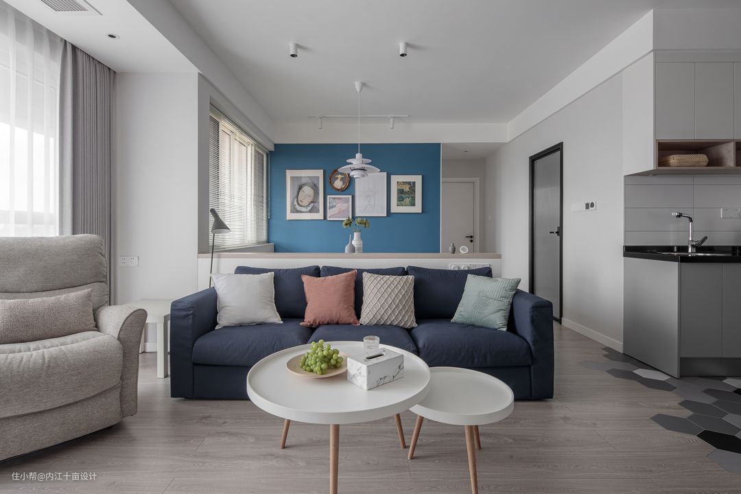 布置深蓝色布艺沙发与北欧风茶几,加入多彩抱枕点缀