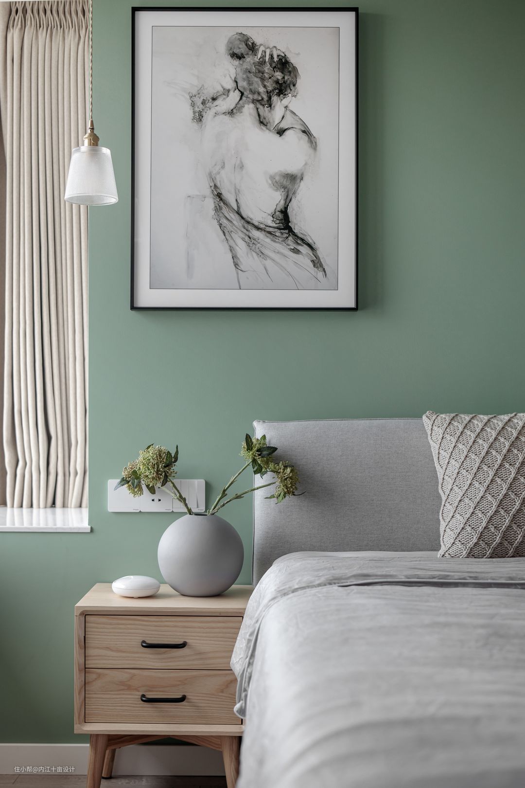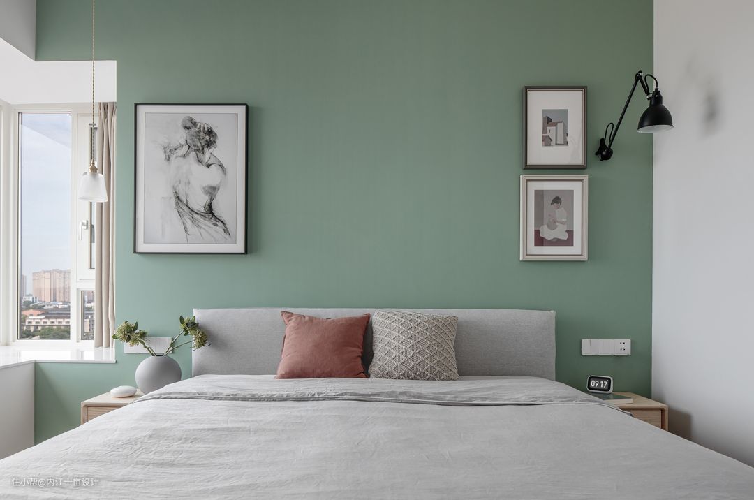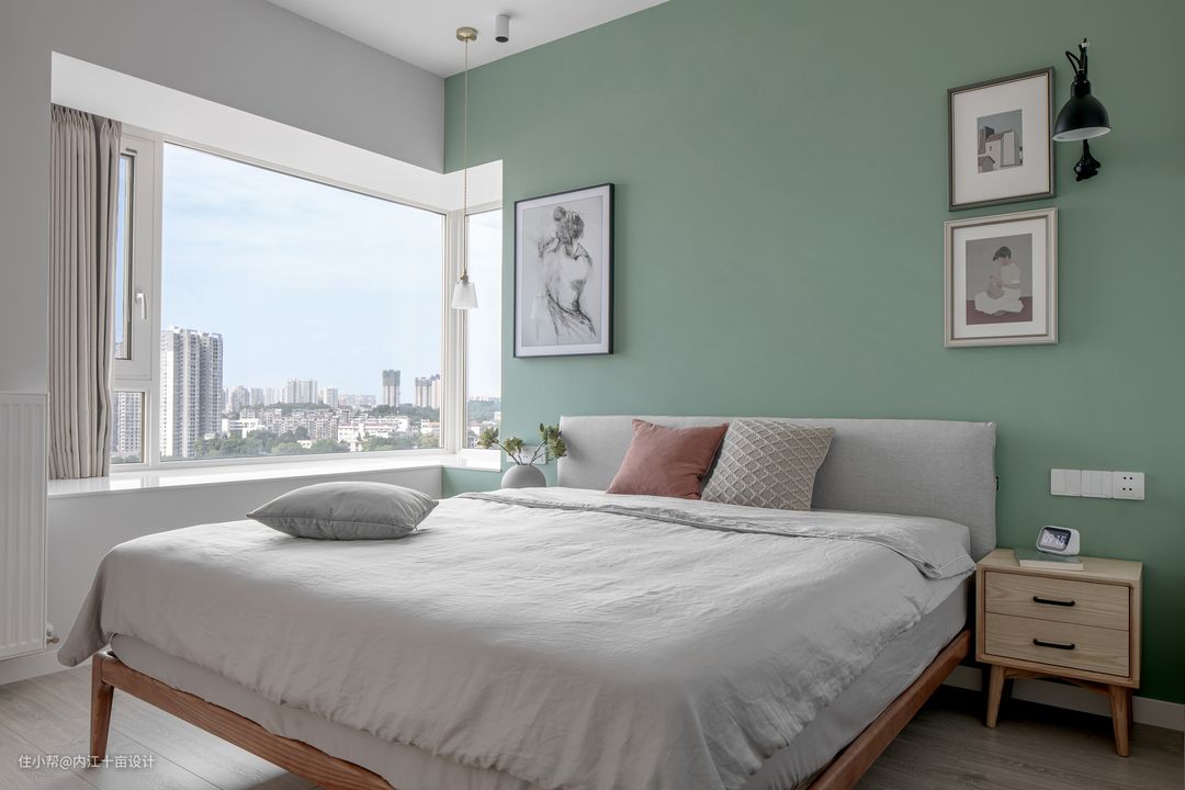 主卧,薄荷绿背景墙搭配简约家具,清新自然,飘窗成为卧室休憩一角