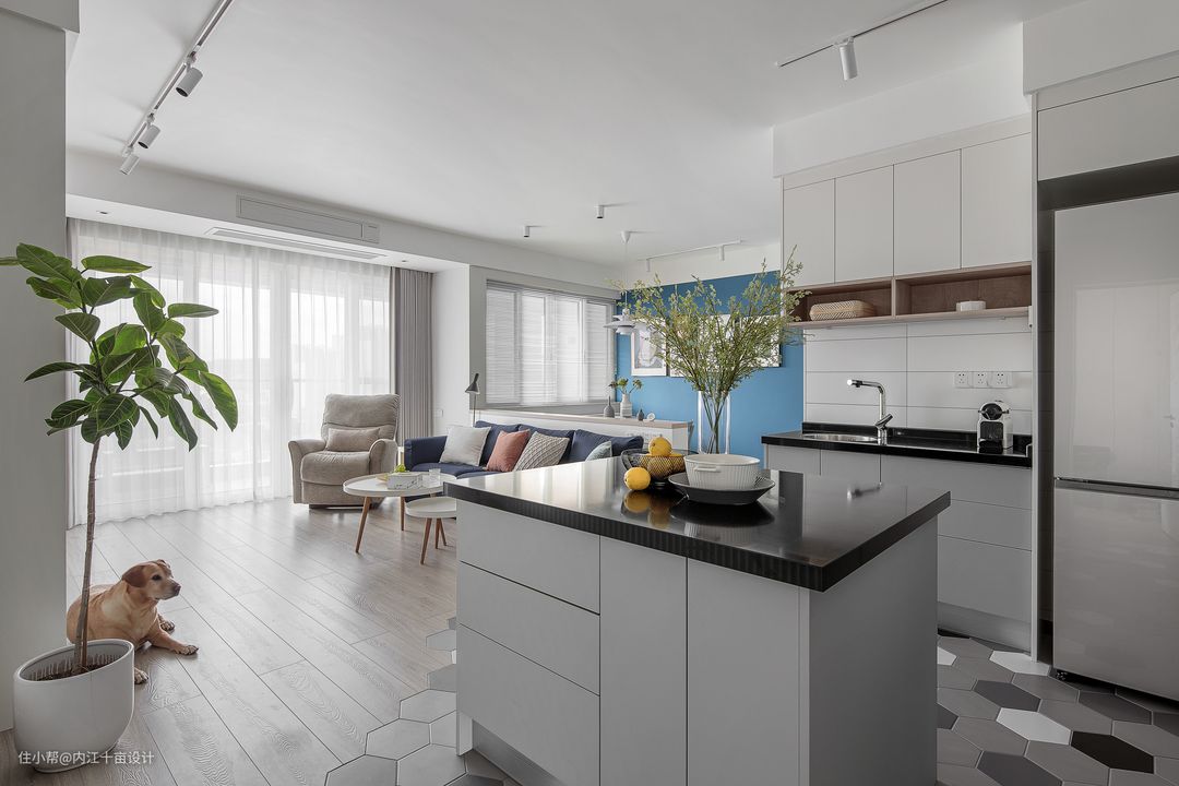 经过玄关右手边规划为西厨区,设置中岛,背景做了储物柜,将双开门冰箱放在厨房门口,拿取动线流畅
