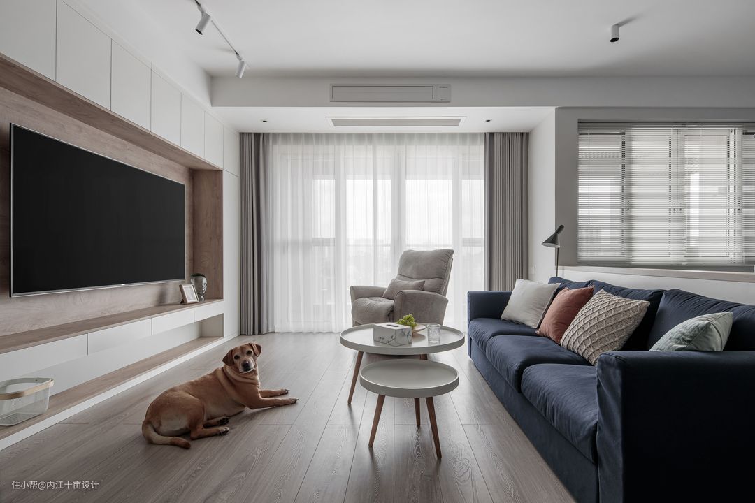 客厅以白木色为基调,木地板搭配无主灯顶面,简约大气
