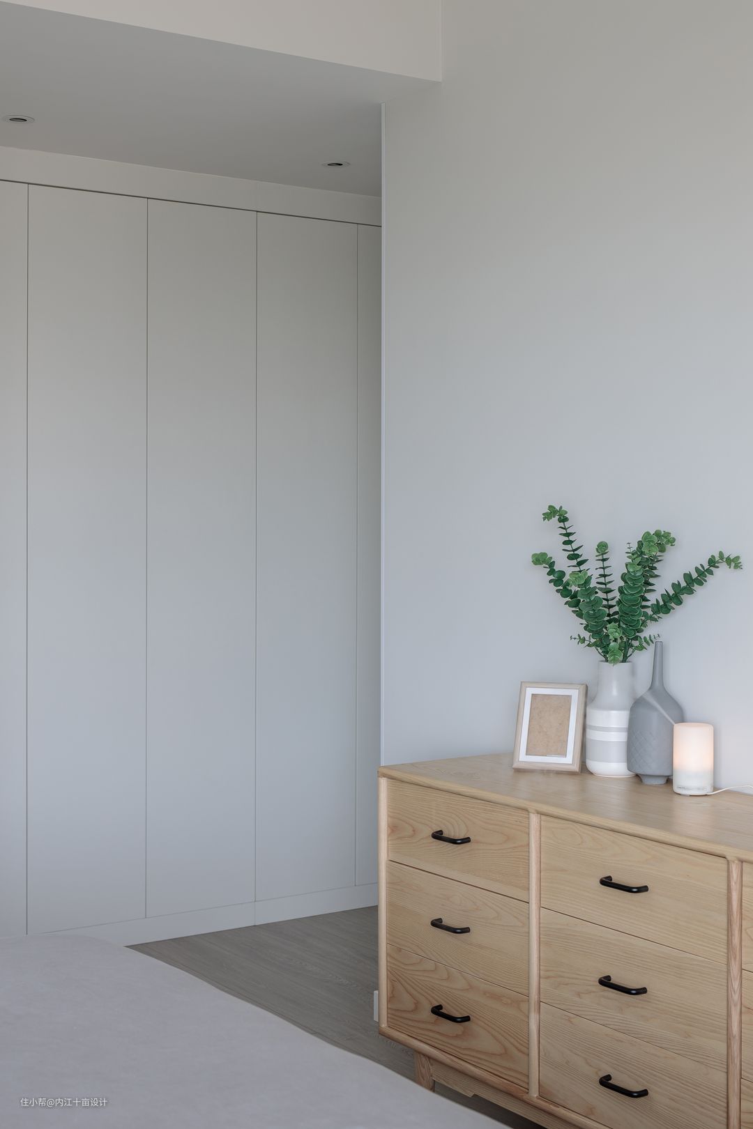 床尾放置成品斗柜,过道定制整排白色置顶衣柜,无把手设计更显干净简洁