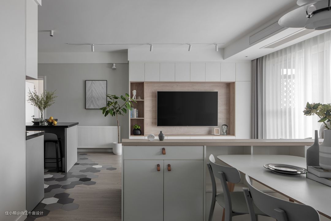 打造整墙电视储物柜,柜门采用封闭式与开放式结合,满足不同形式的收纳,地面通过不同的材质进行区域划分