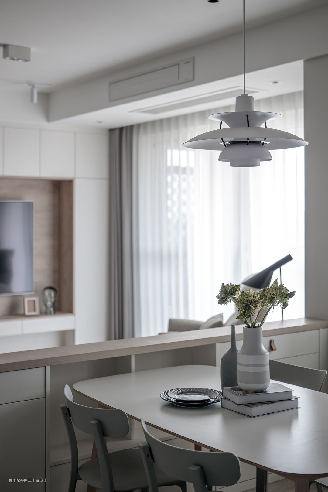 沙发背后是餐厅,把原来的小房间隔墙打通,定制一排矮柜,既能隔断空间,又具备储物功能