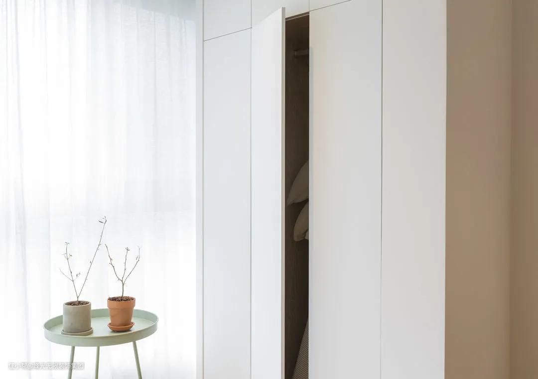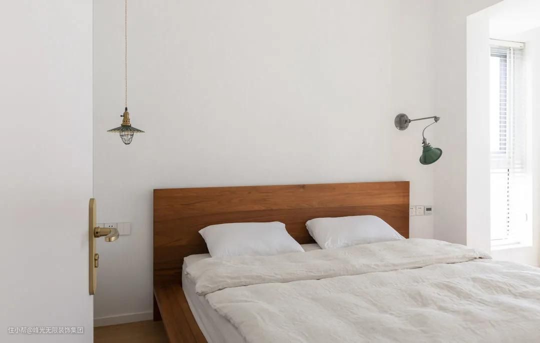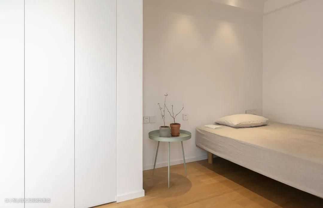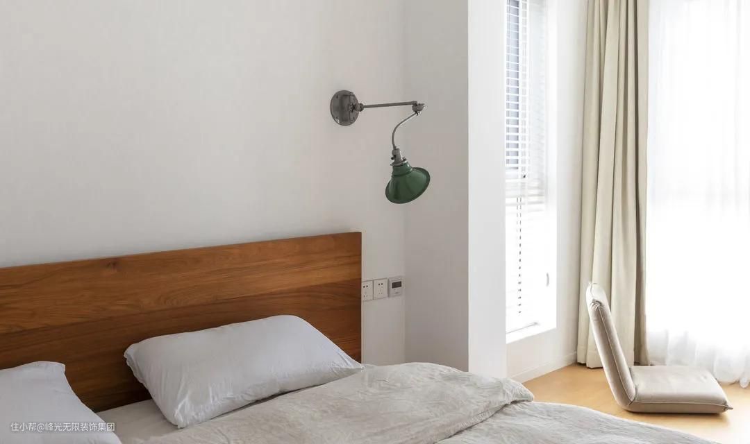 主卧,将阳台打通包了进来,既扩大了使用面积,还增加了采光及通透性。整体涂刷大白墙,搭配简单的木质家具,营造出温润舒适的睡眠氛围。床尾摆放了可移动式小木桌,不仅满足日常梳妆需求,还可以阅读和办公,灵活多变。