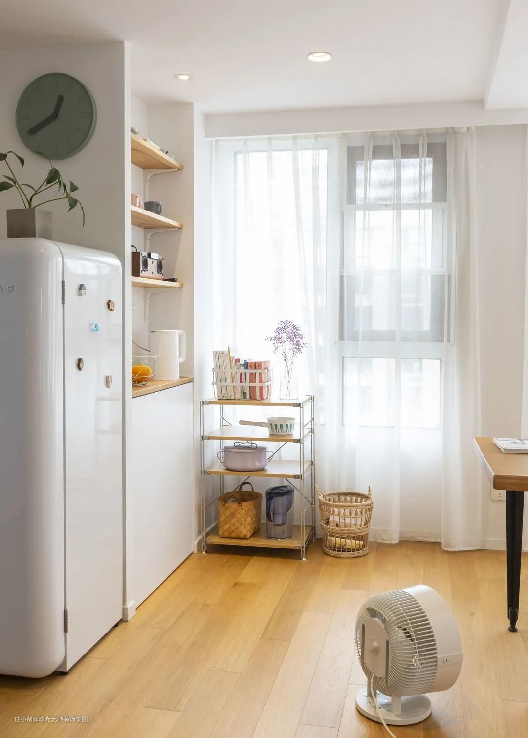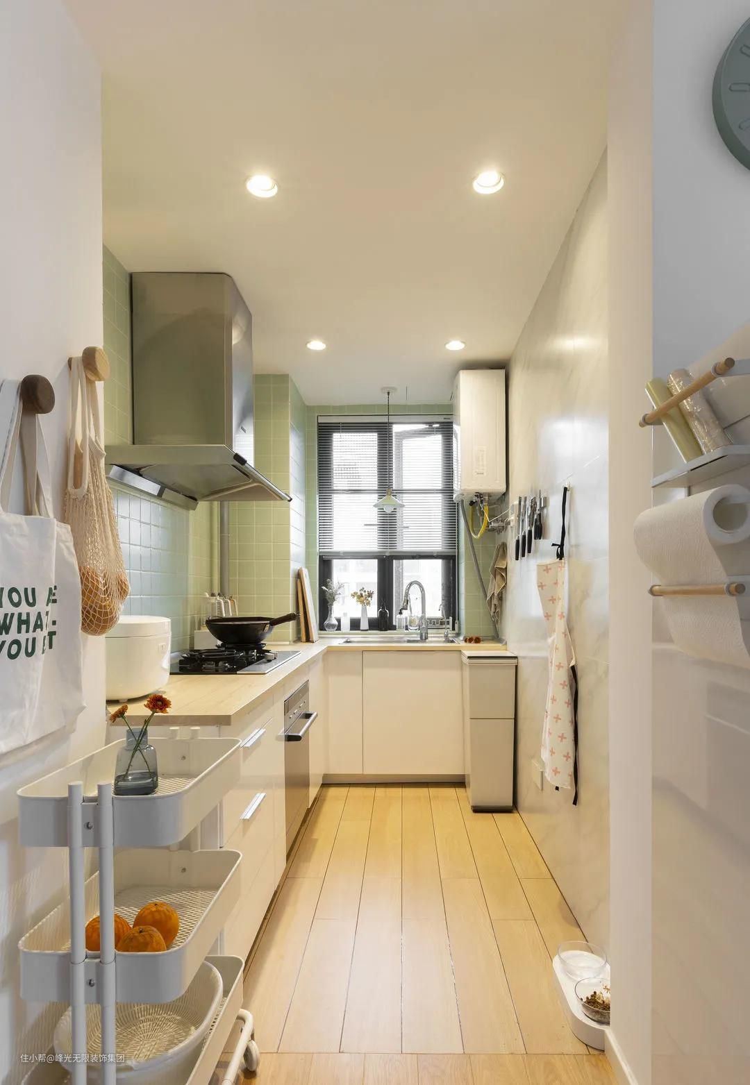 狭小的厨房空间,定制了L型的橱柜布局,提供了充足的收纳+操作空间。地面铺贴木纹砖,搭配薄荷绿小方砖和白色橱柜,清新自然,甜而不腻。