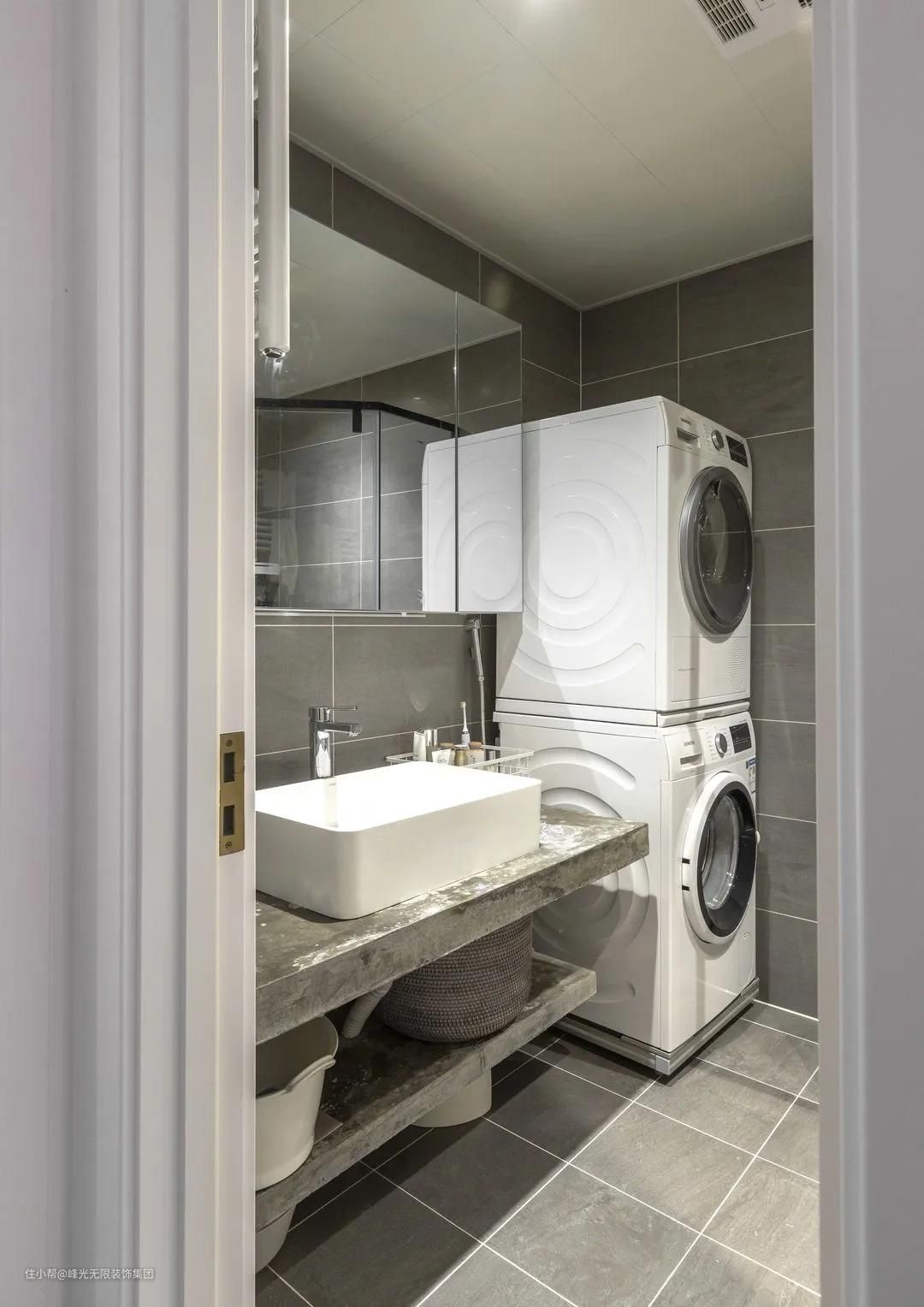 卫生间,定制了两层石材搁板代替浴室柜,既满足了收纳需求,还扩大了视觉效果。一侧塞下了洗衣机、烘干机,解放了阳台空间。安装了玻璃淋浴房,做干湿分离设计,保证空间的干净清爽。