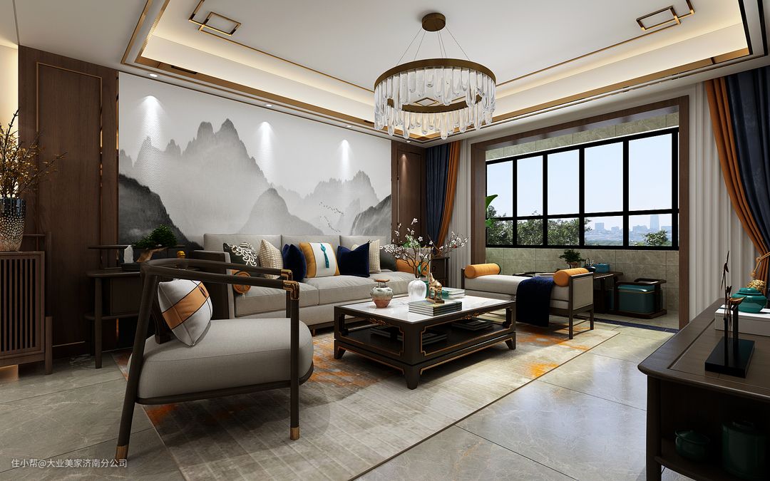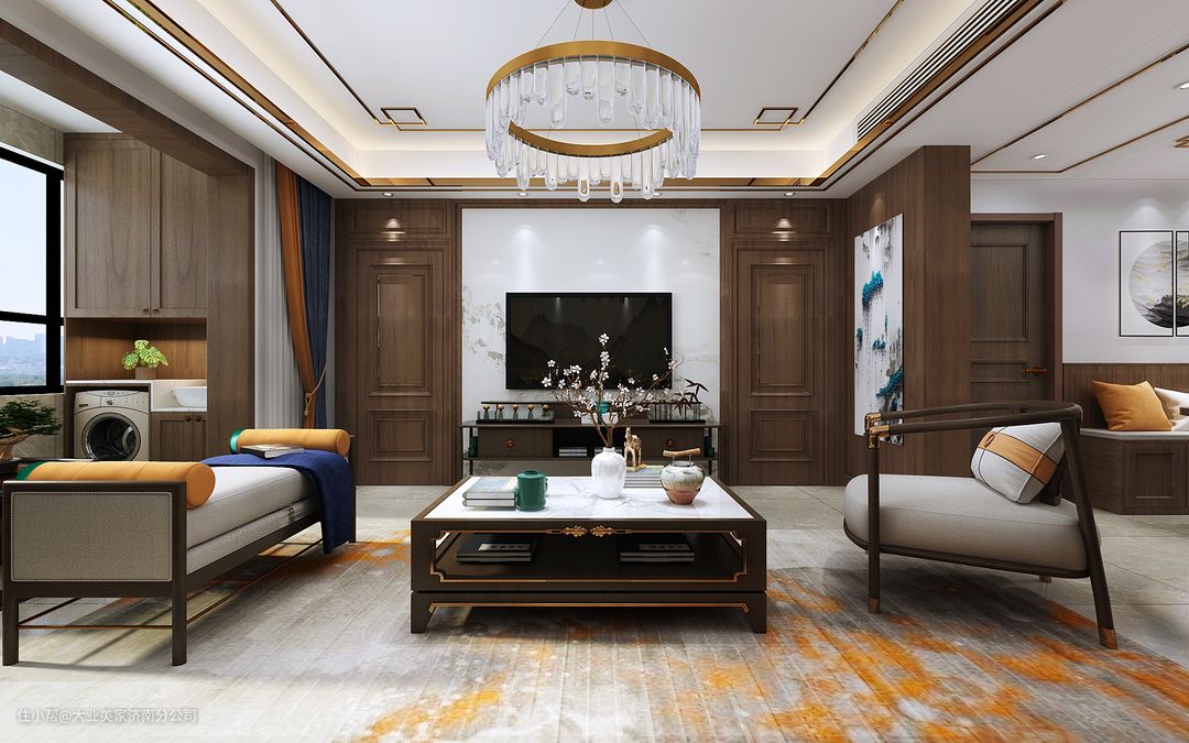 客厅延续了传统围合式的方式进行,布局中正、大气、开敞,家具在空间中的放置分合有致,既可众客以聚,亦可围合小叙,椅踏端庄、案几有序、器物风雅,极具大宅之气