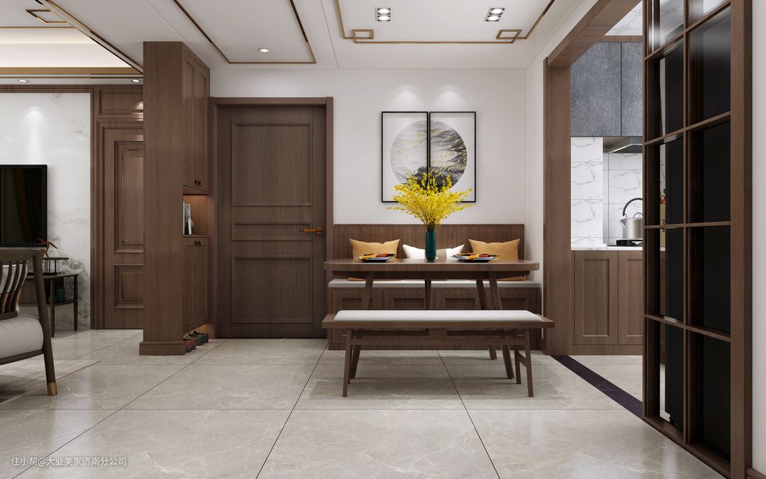 本套案例为轻奢新中式,整体空间整体视距开阔,影视墙和沙发背景墙采用相互呼应的设计手法, 整体以浅灰木色为基调,局部软装配式黄色与蓝色为跳色点缀,使整体空间色彩均衡。走廊 空间通过吊顶的修饰,使整个空间融为一体,走廊尽头设有装饰画与客餐厅配饰相呼应,使得整个空间融为一体从视觉上让走廊增加了亮点